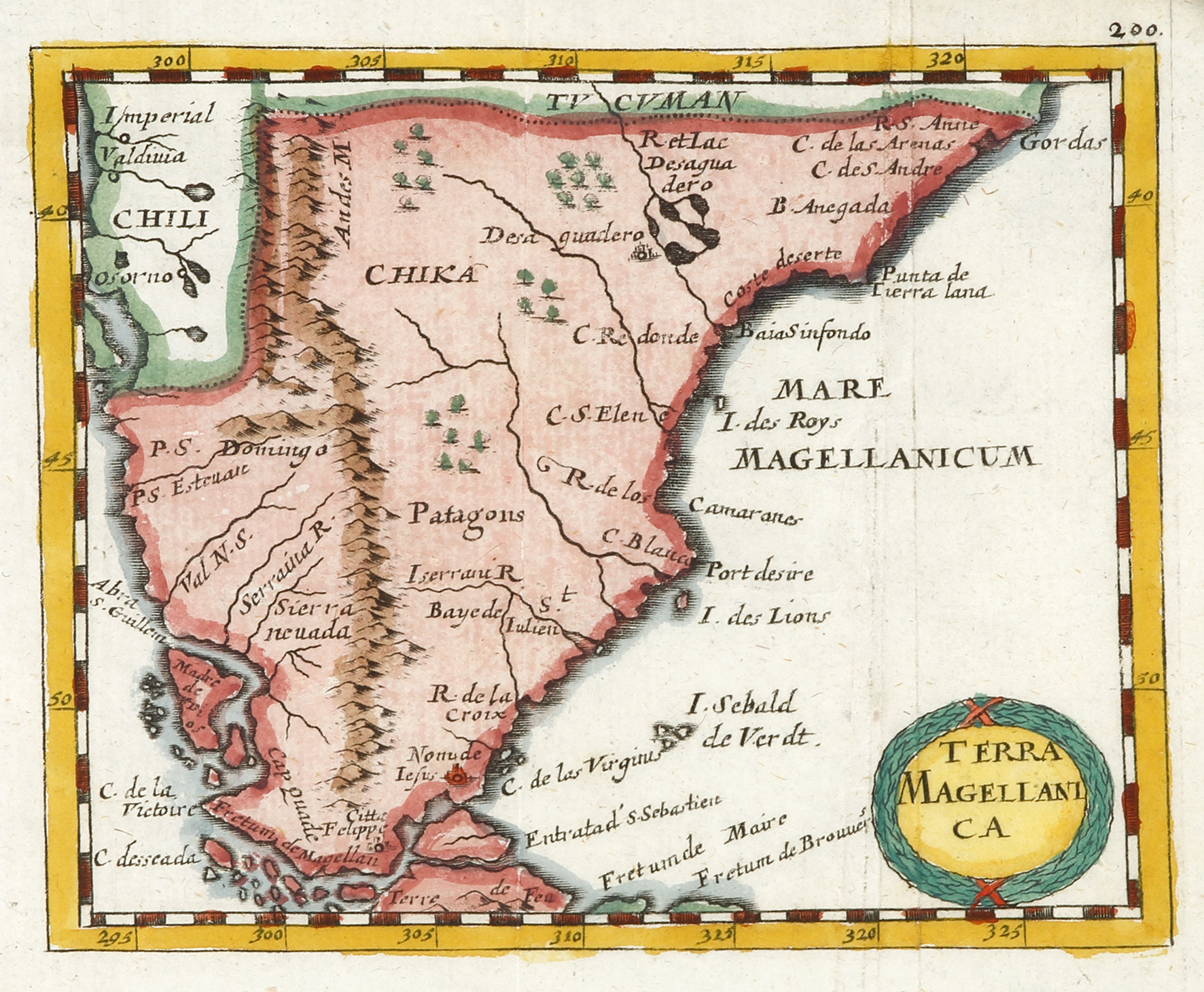 Rare early miniature map of Patagonia with the north coast of Tierra del Fuego by Pierre Duval with a title cartouche at lower right. The Falklands are named, I. Sebald, from a Dutch voyage under Sebald de Weert who named them the Sebaldines in 1600.
