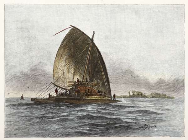C.19th engraving of Ratu Seru Epenisa Cakobau’s canoe (occasionally spelled Cacobau or Thakombau) (c.1815-1883) who was a Fijian Ratu and warlord (Vunivalu) and who united part of Fiji’s warring tribes under his leadership, establishing a united Fijian kingdom.