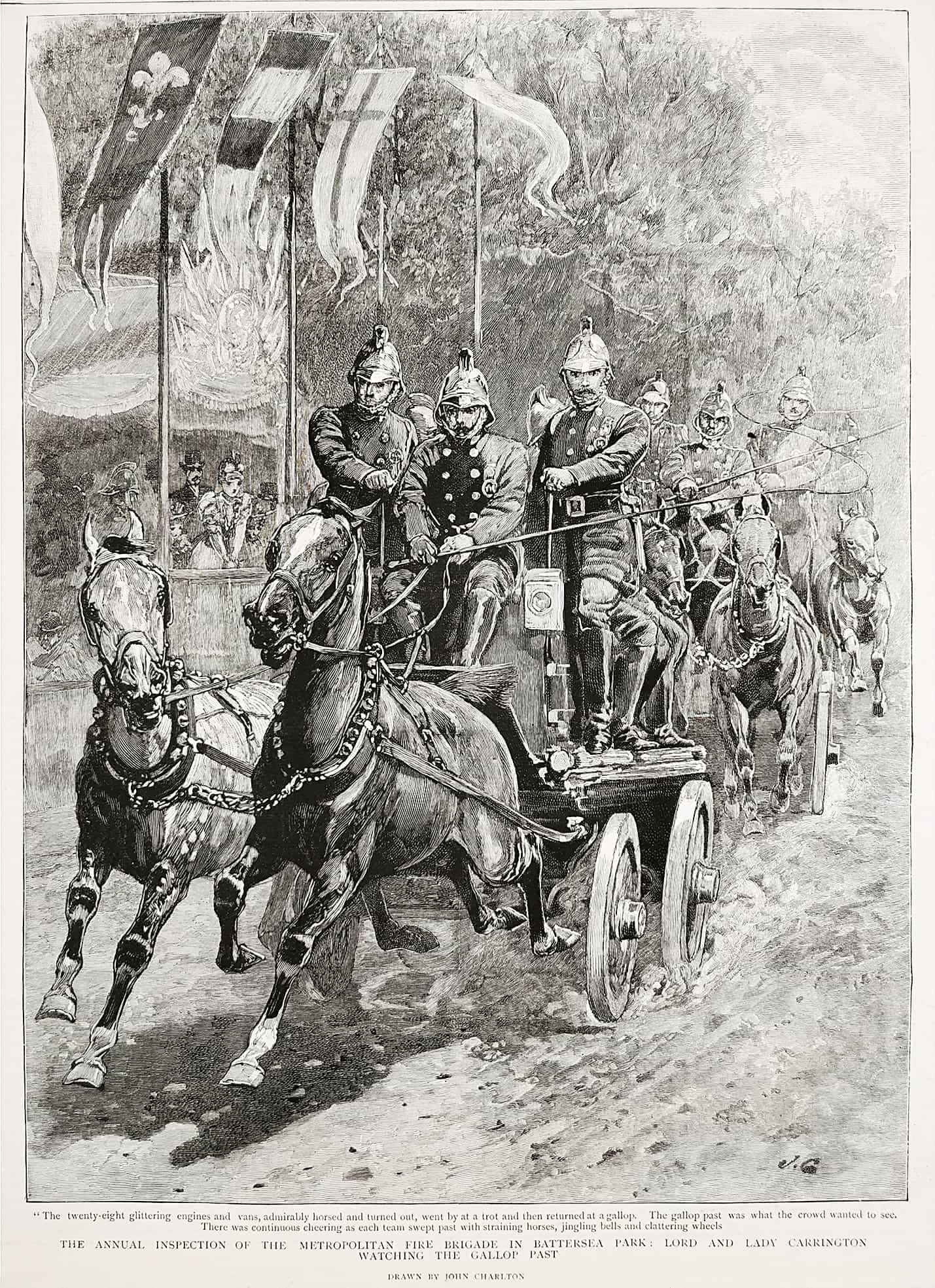Engraving of fire fighters participating in the Annual Inspection in London. From the original edition of the Graphic