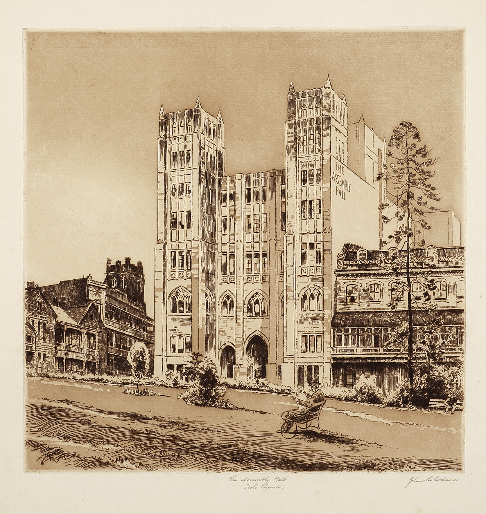 Titled The Assembly Hall Scots Church/ Size image: 230mm x 228mm / Size of paper : 383mm x 292mm / proof, unnumbered / signed in pencil.