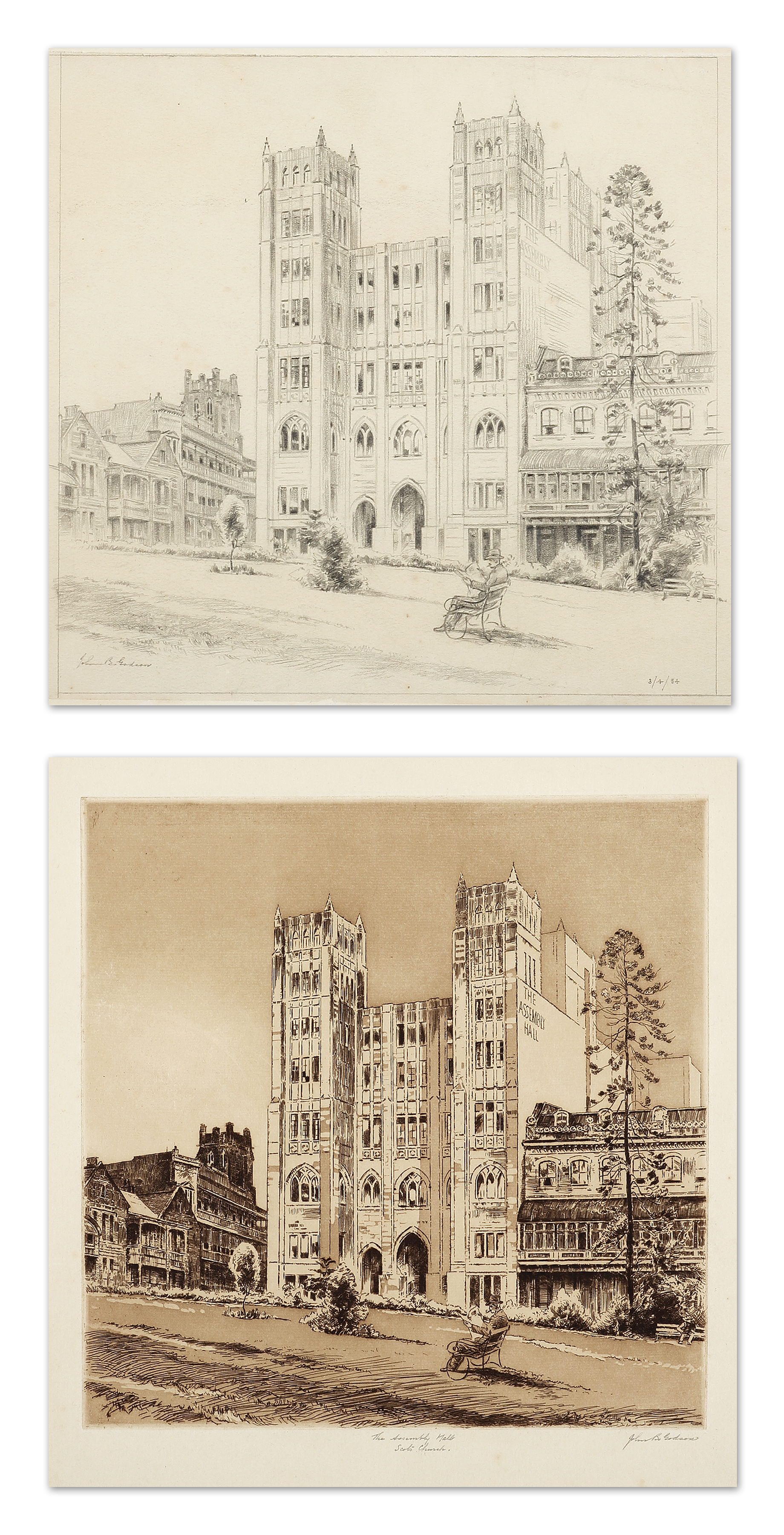 Fine signed proof etching with the original pencil drawing by the master artist and print maker John Barclay Godson for the Assembly Hall Scots Church, Margaret Street, Sydney. SOLD AS A PAIR