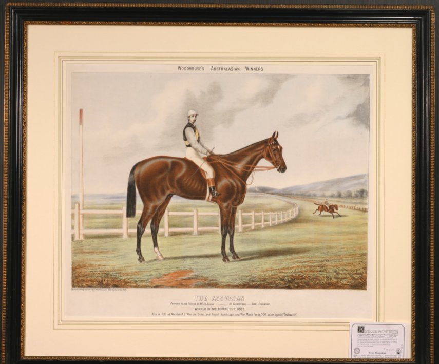 From "Woodhouses Australian Winners", a very rare separately issued Australian equestrian portrait. THE ASSYRIAN Age: 5 Gender: h Odds: 33/1 Jockey: C. Hutchins Trainer: J. E. Saville Weight: 7.13 Colour: Brown Margin: 25 1/2 len, 1/2 len Time: 3:40.00 Owner: Mr J. E. Saville