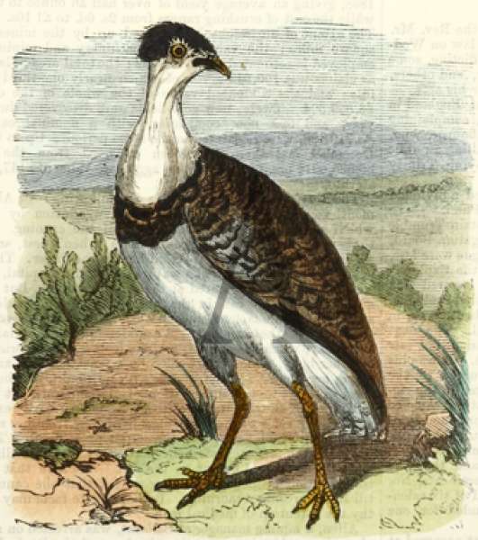 Scarce colonial engraving of the Australian Bustard. Common name: Australian Bustard Aboriginal names: Barawaa in Gamilaraay / Gamilaroi / Kamilaroi Barawaa in Yuwaalaraay Gooli-Gooli in Wudjari Gumbulgaban in Yuwaalaraay Gumbulgaban in Yuwaalayaay Pibaalyar in Wudjari Modern binomial name: Ardeotis australis … Read Full Description