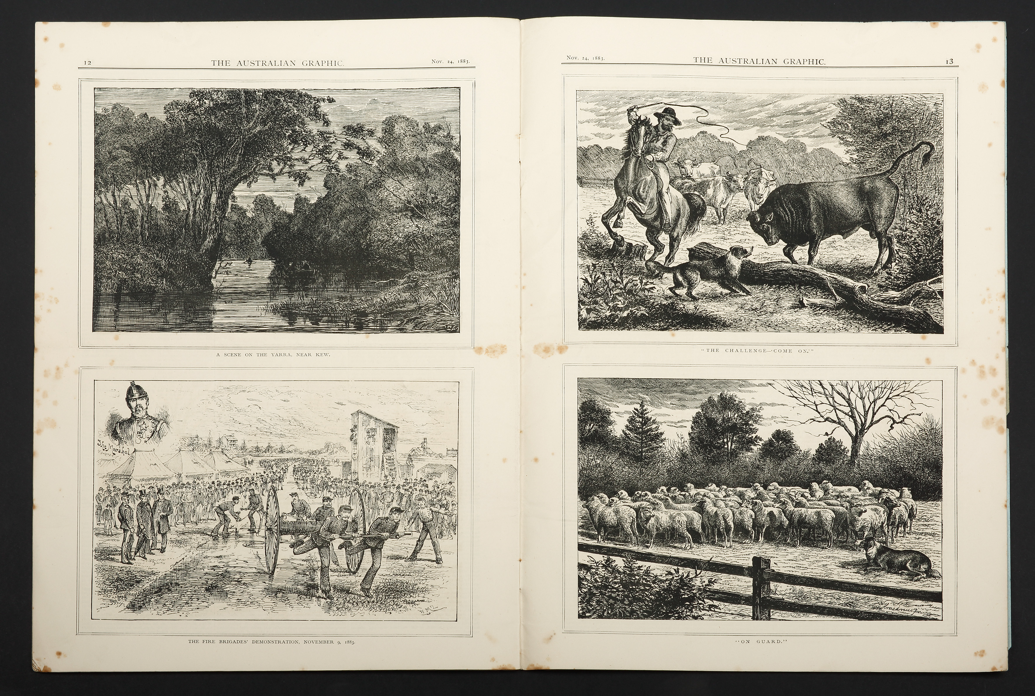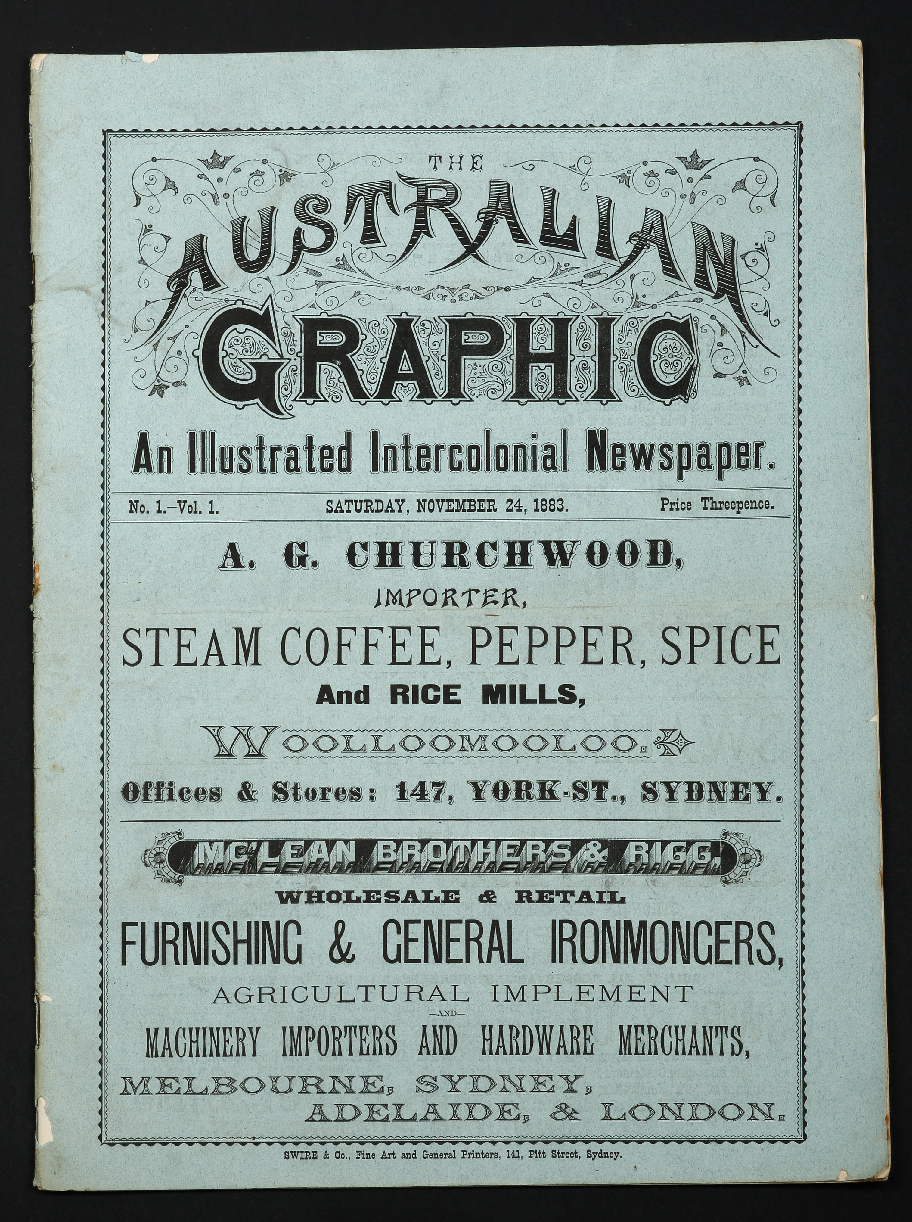 Very rare copy of the first number of this short lived Australian Newspaper. Incredibly, this newspaper used glass for all the engraving plates which the proprietors claimed, reduced the cost by 2/3 from the traditional method of using wood engravings. … Read Full Description