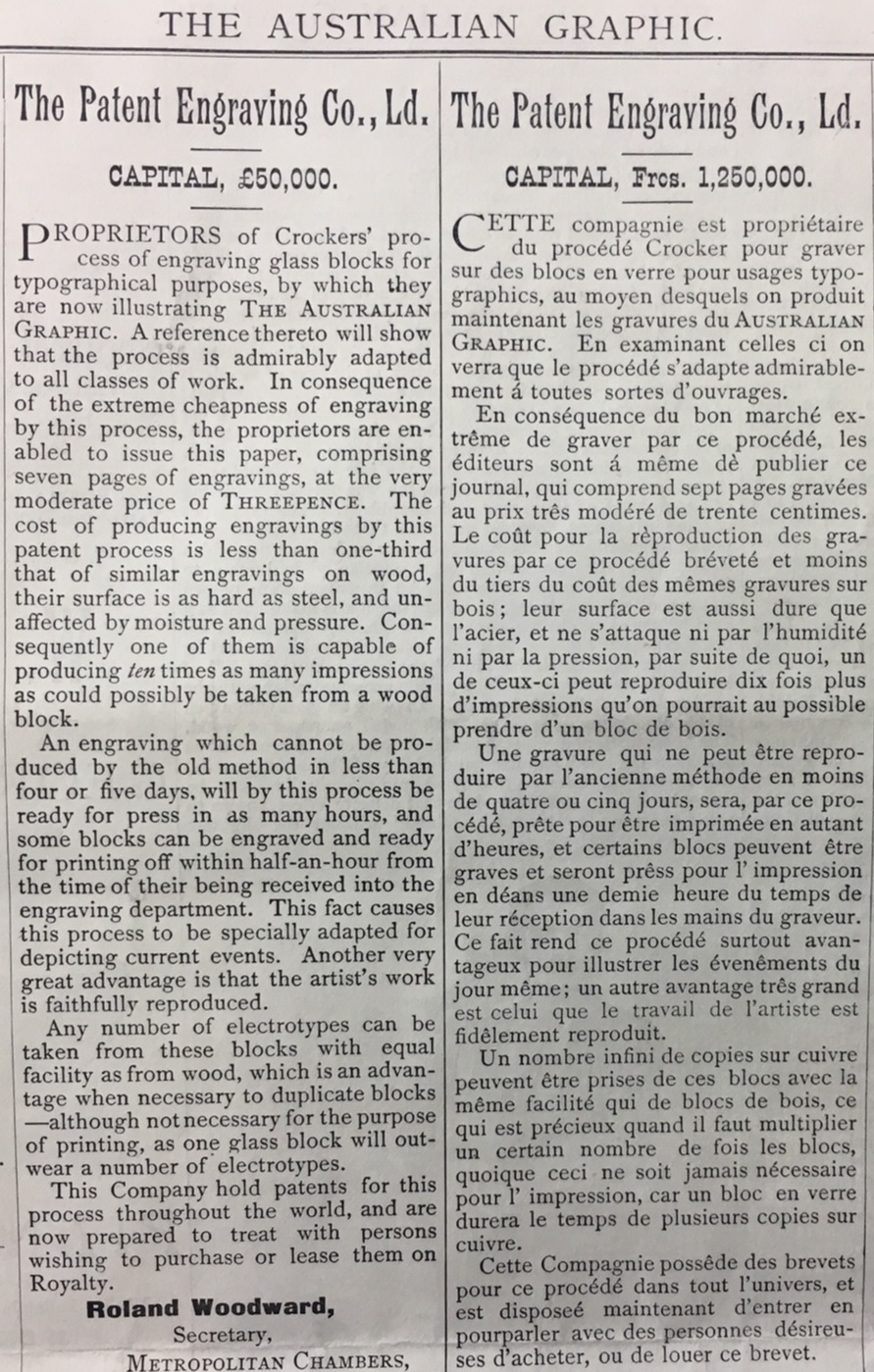 Incredibly, this newspaper used glass for all the engraving plates which the proprietors claimed, reduced the cost by 2/3 from the traditional method of using wood engravings. They stated, that the glass plates didn’t break with the pressure of the printing press, were easy and quick for the artist to create, being able to apply their designs directly onto the glass and that the plates didn’t wear. (See image of advertisement)