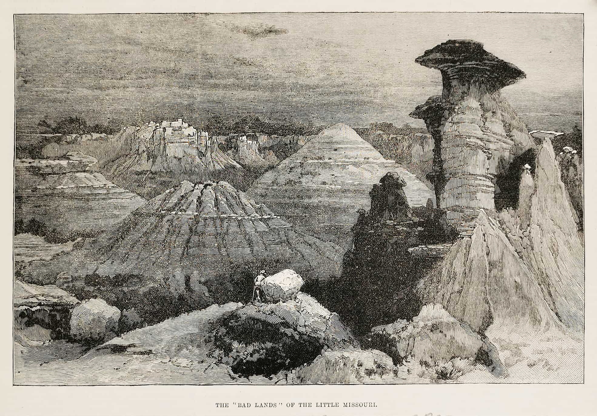 Engraving of the Little Missouri Badlands of western North Dakota, a collection of rugged and spectacular landforms bordering the Little Missouri River. These badlands extend from the South Dakota border to the point where the Little Missouri joins the channel of the ”Big’ Missouri at Lake Sakakawea.