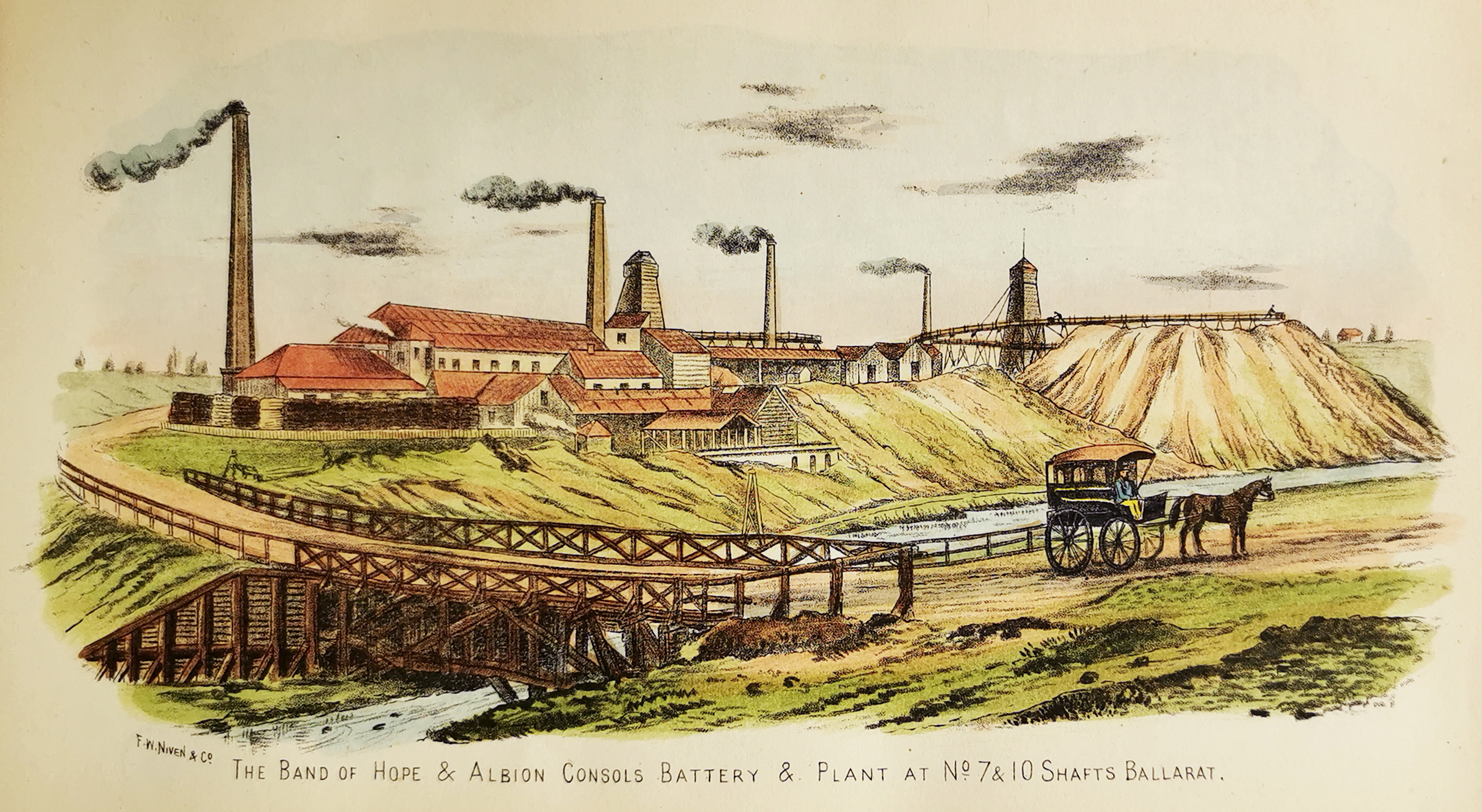C.19th lithograph of the Band of Hope and Albion Consols Batery was considered the largest historic gold mine on the Ballarat goldfield.