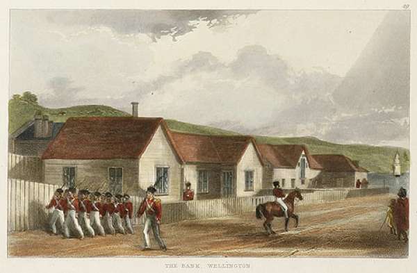 Scarce hand coloured c.19th engraving by Samuel Charles Brees of the bank, Wellington. The view is taken from the corner of Mr Jenkins’ tavern; the bank is close in the foreground. The premises next the harbour were formerly Mr John … Read Full Description