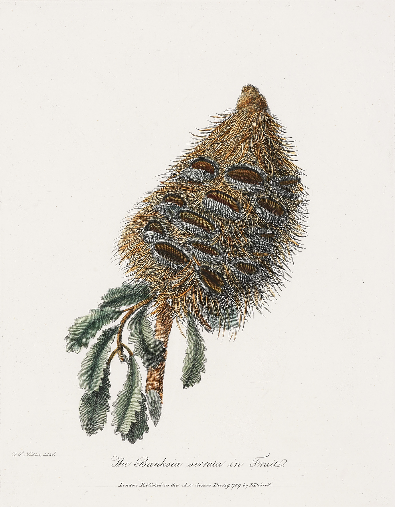 Rare. c.18th hand coloured engraving of Banksia serrata which was first collected at Botany Bay on 29 April 1770, by Sir Joseph Banks and Dr Daniel Solander, naturalists on the Endeavour, during Cook’s first voyage.