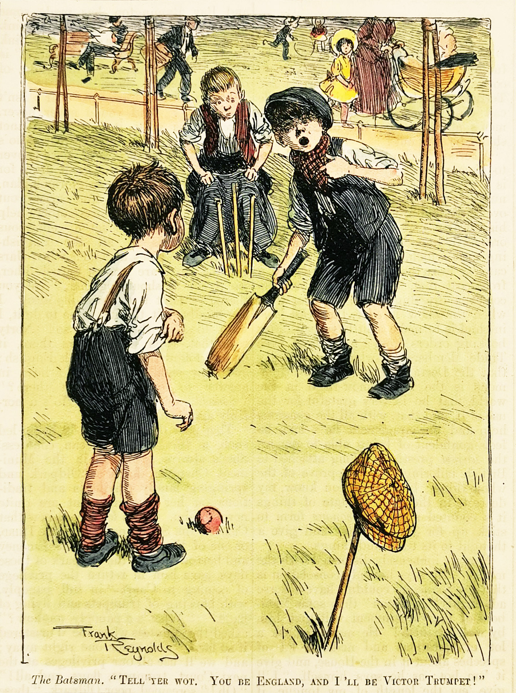 Amusing cricket cartoon making reference to the Australian cricketer, Victor Trumpter, from the original edition of Punch.
