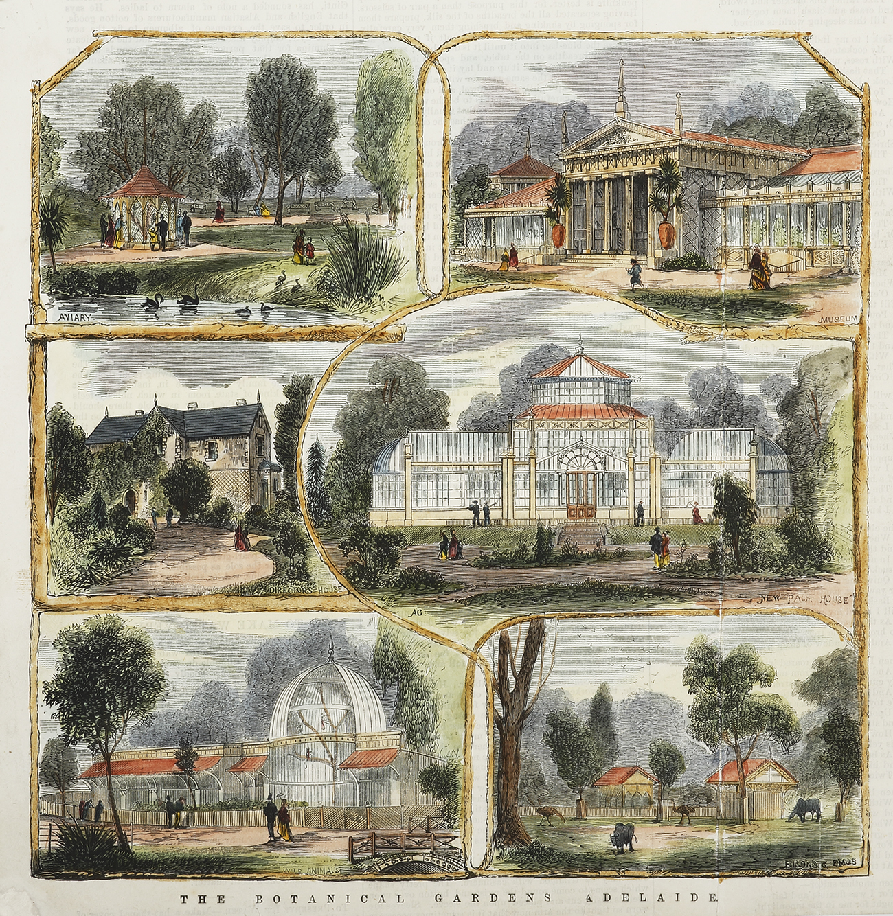 Scarce colonial engraving of the Adelaide Botanical gardens. The lower inset titled; Bisons and Emus, shows the Shorthorn heifer, bred by Messrs. Robertson Bros. of Colac. Inset titles; Aviary, Museum, Directors house, New palm house, Wild animals, Bisons and emus. … Read Full Description