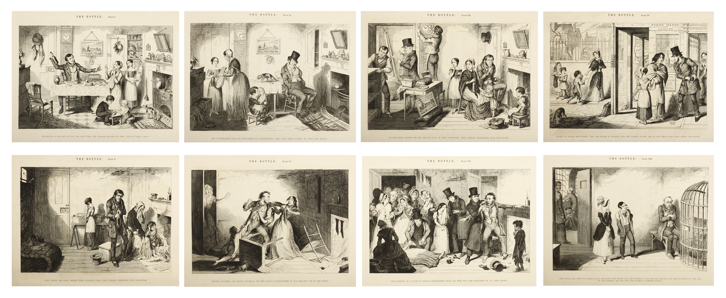 Rare set of eight large engravings by George Cruikshank. From the late 1840’s Cruickshank, a reformed heavy drinker became increasingly involved with the temperance movement. This series of eight engravings is the best known of his works in support of the National Temperance Society.