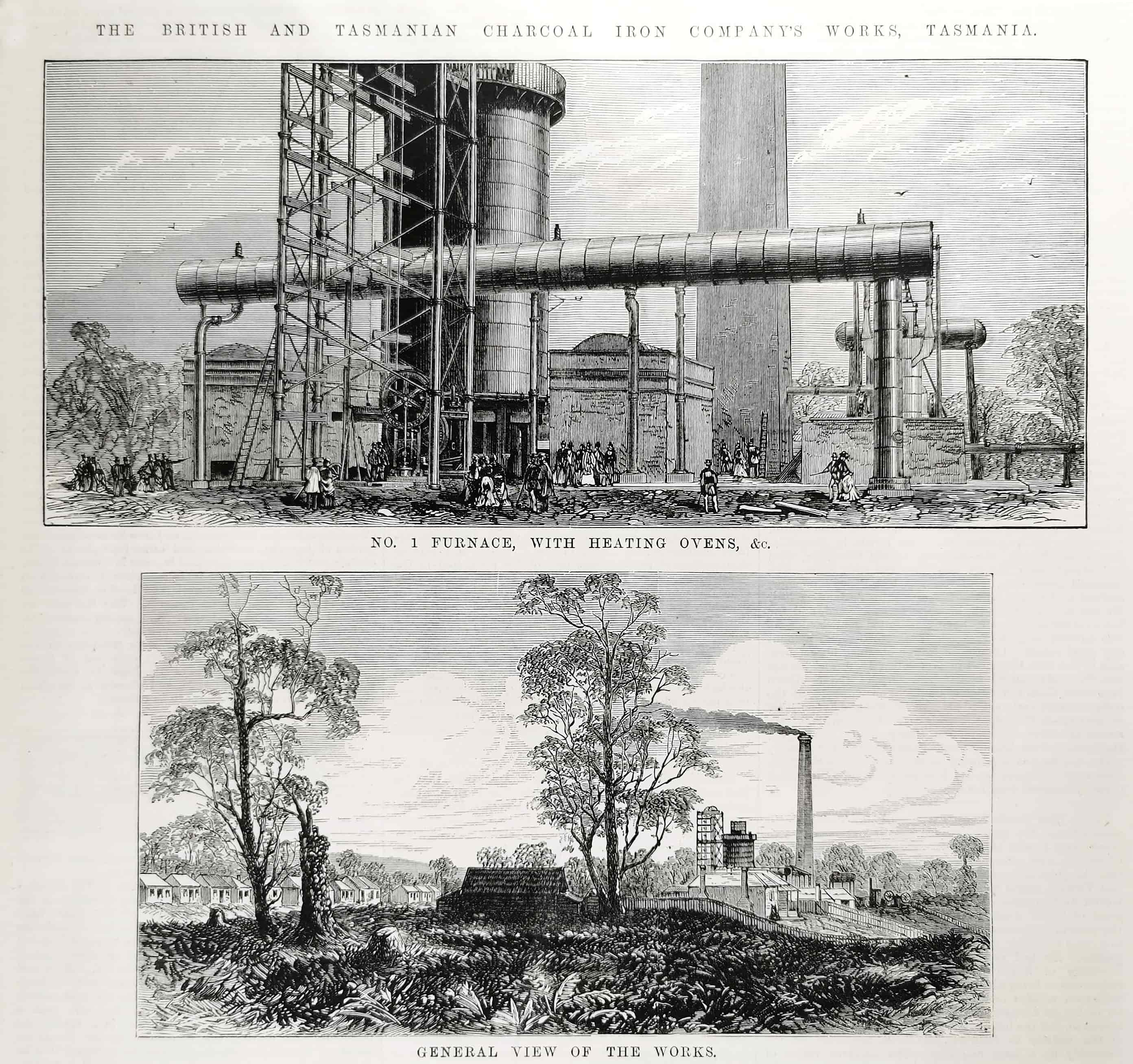Scarce colonial engraved views of the British and Tasmanian Charcoal Iron Company , an iron mining and smelting company that operated from 1874 to 1878 in Northern Tasmania. It was formed by floating the operations of a private company, the Tasmanian Charcoal Iron Company that operated between 1871 and 1874. This venture was the largest of the four that smelted iron from local iron ore in Tasmania during the 1870s. The company’s operations included an iron ore mine near Anderson’s Creek and a railway from the mine to its blast furnace and port near Redbill Point on the West Arm of the Tamar River estuary in Northern Tasmania. Its blast furnace—the largest and most modern in Australia for its time, produced pig-iron June 1876 to August 1877.