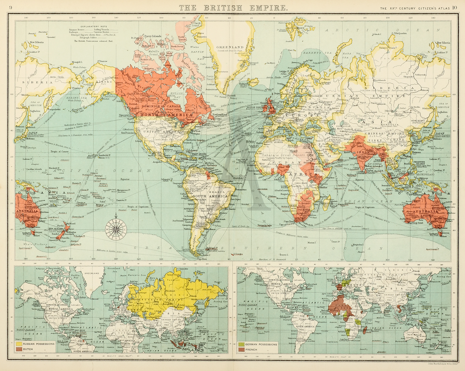 World map on Mercators projection showing the extent of the British Empire at the peak of its influence, with two insets showing Russian, Dutch, German and French possessions.
