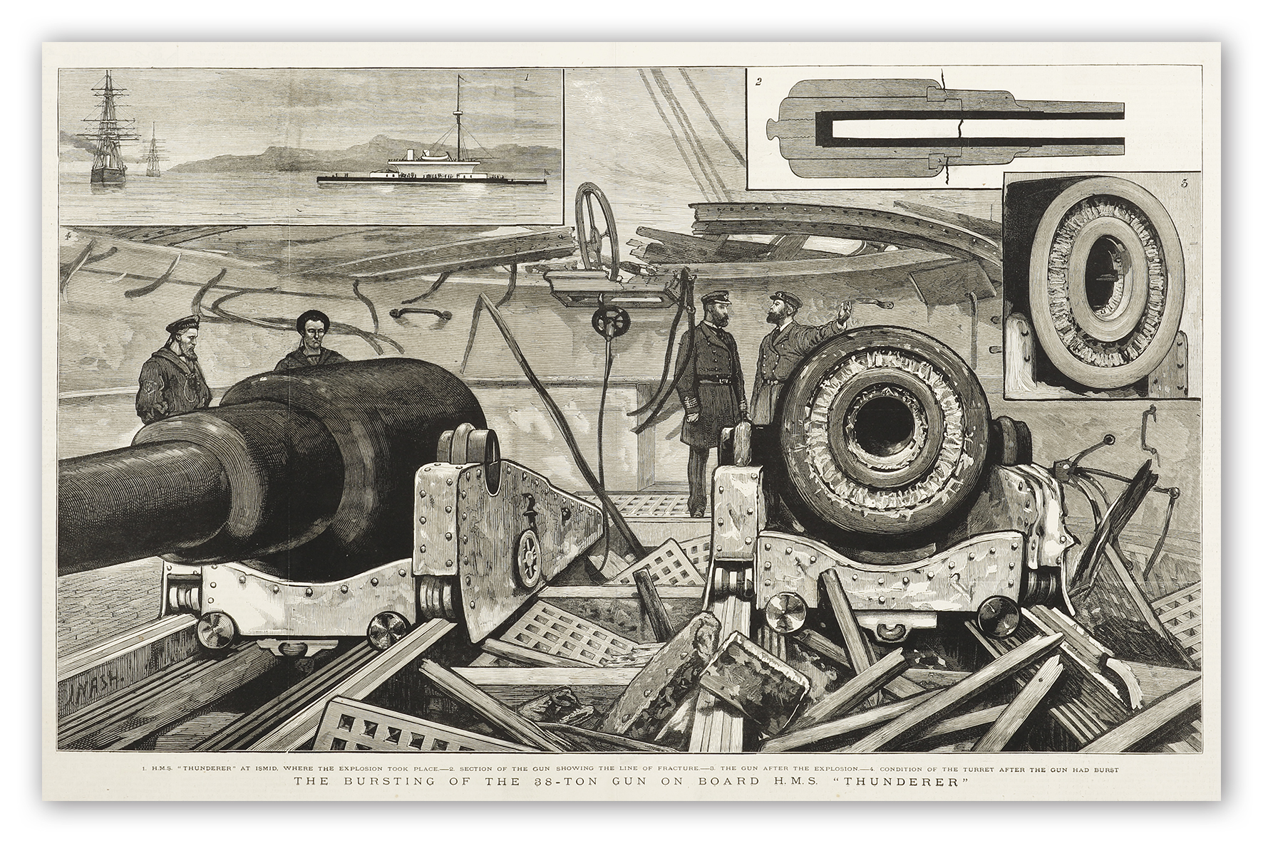 Double page engraving of the H.M.S. Thunderer and its canons. Insets 1. H.M.S. “Thunderer” at Ismid, where the explosion took place. 2. Section of the gun showing the line of fracture. 3. The Gun after the explosion. 4. Condition of … Read Full Description