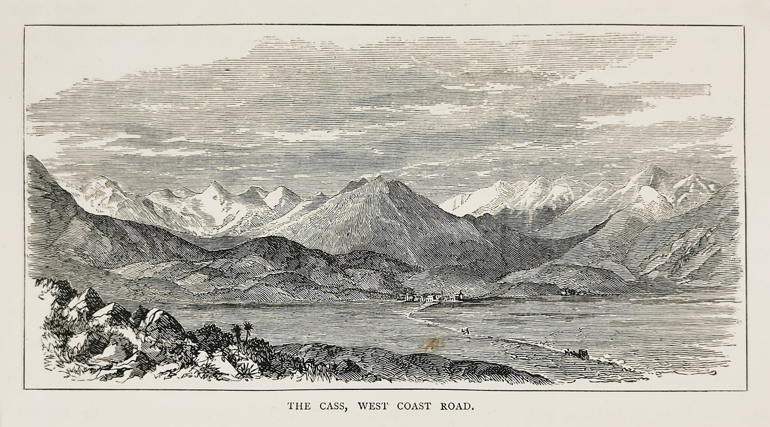 Colonial engraving of The Cass, West Coast Road, located in the Selwyn District of the Canterbury region in New Zealand’s South Island.