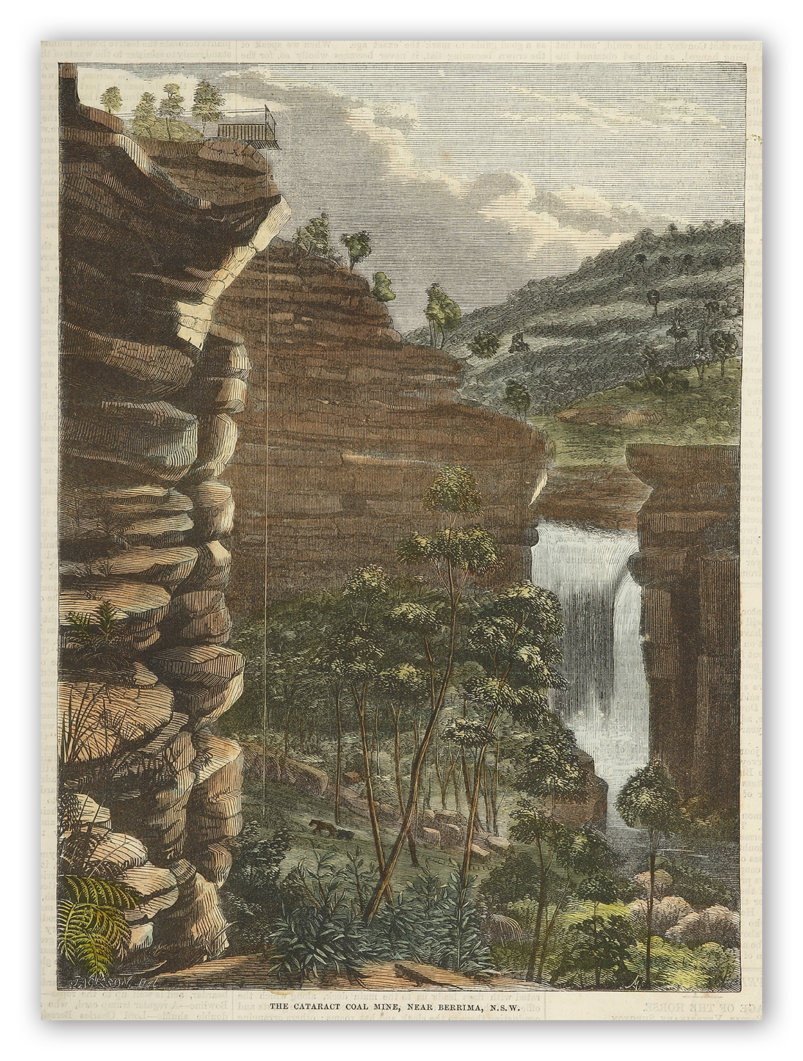 Rare engraving of the Cataract mine was opened next to a waterfall on the banks of the Medway Rivulet, a tributary of the Wingecarribee River.