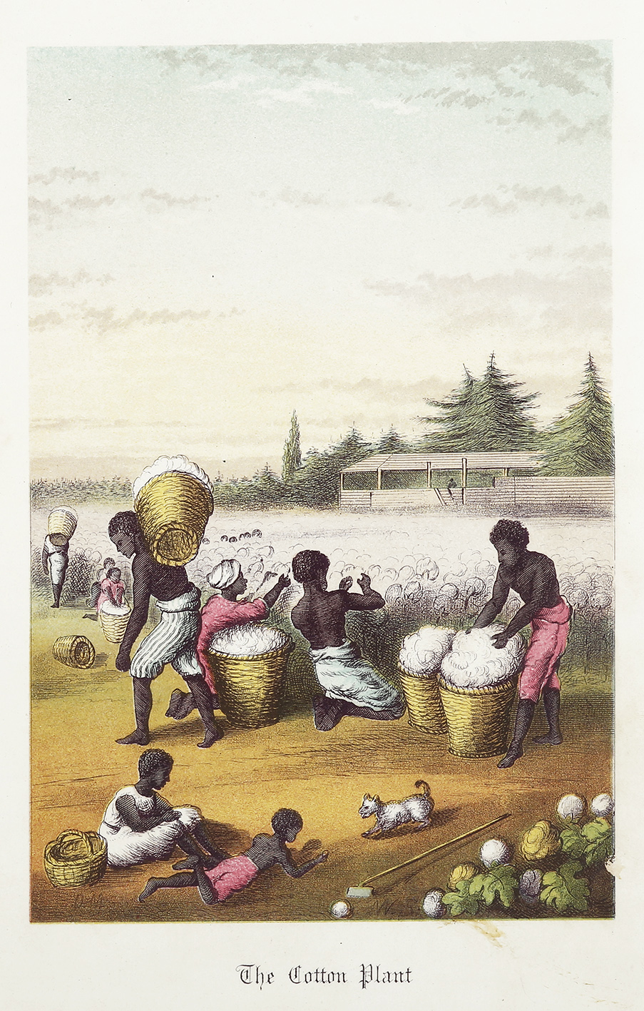 Small C19th engraving of a scene of cotton pickers.