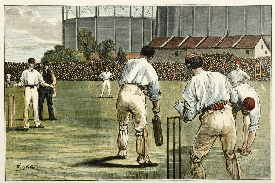 Players from left to right Read, Peate, Bannerman (bat), Hon. Lyttelton and Grace (picking up the ball).