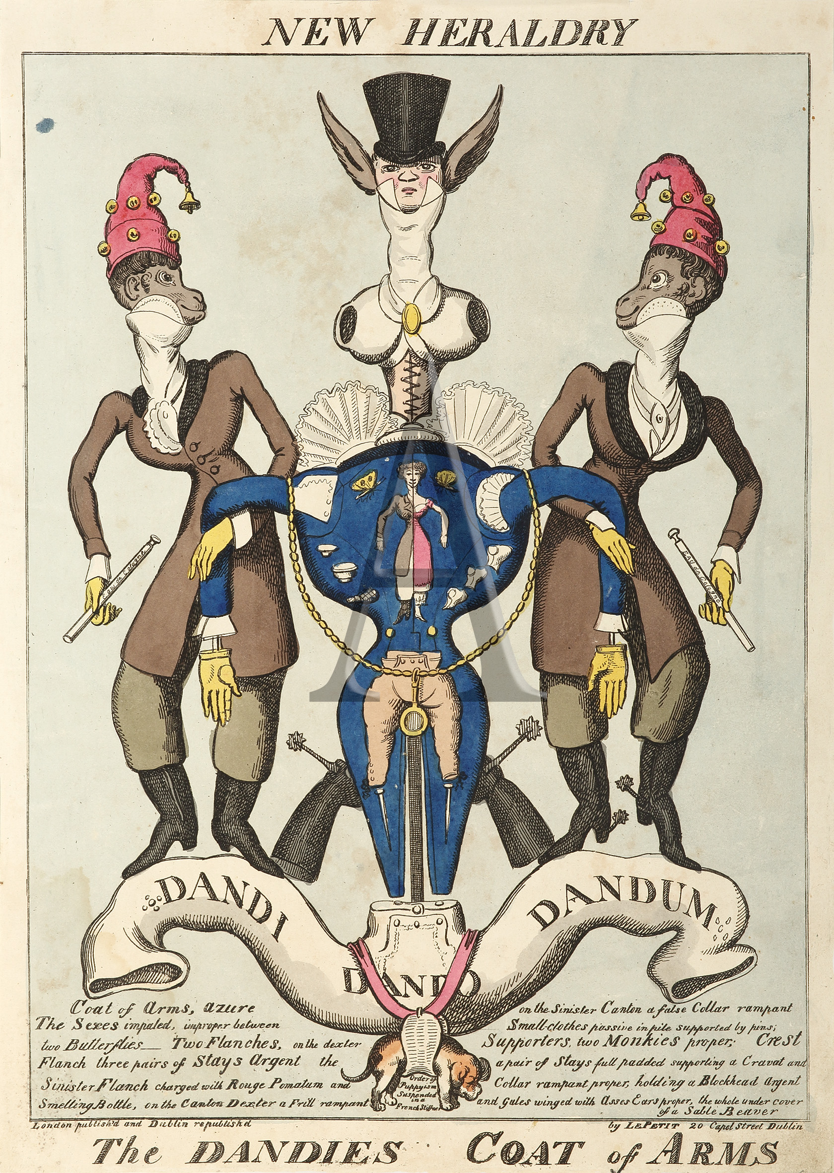 Rare Irish edition of George Cruickshank’s famous satire on Dandism. The Dandies Coat of Arms.Left: Coat of Arms, Azure The Sexes impaled, improper between two Butterflies Two Flanches, on the dexter Flanch three pairs of Stays Argent the Sinister Flanch … Read Full Description