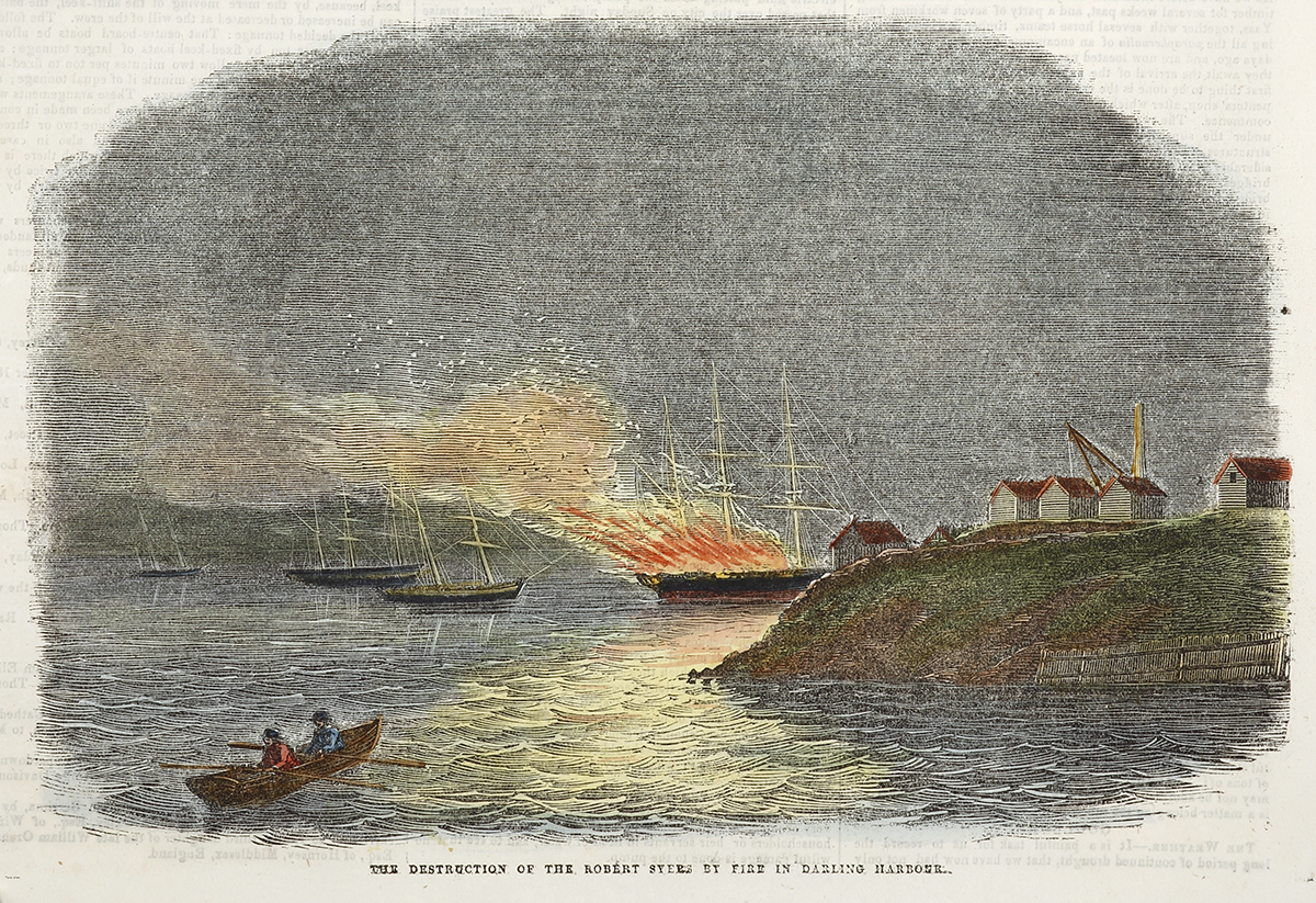 Very rare colonial engraving of the barque Robert Syers s, at her anchorage off the Market Wharf, Darling Harbour.