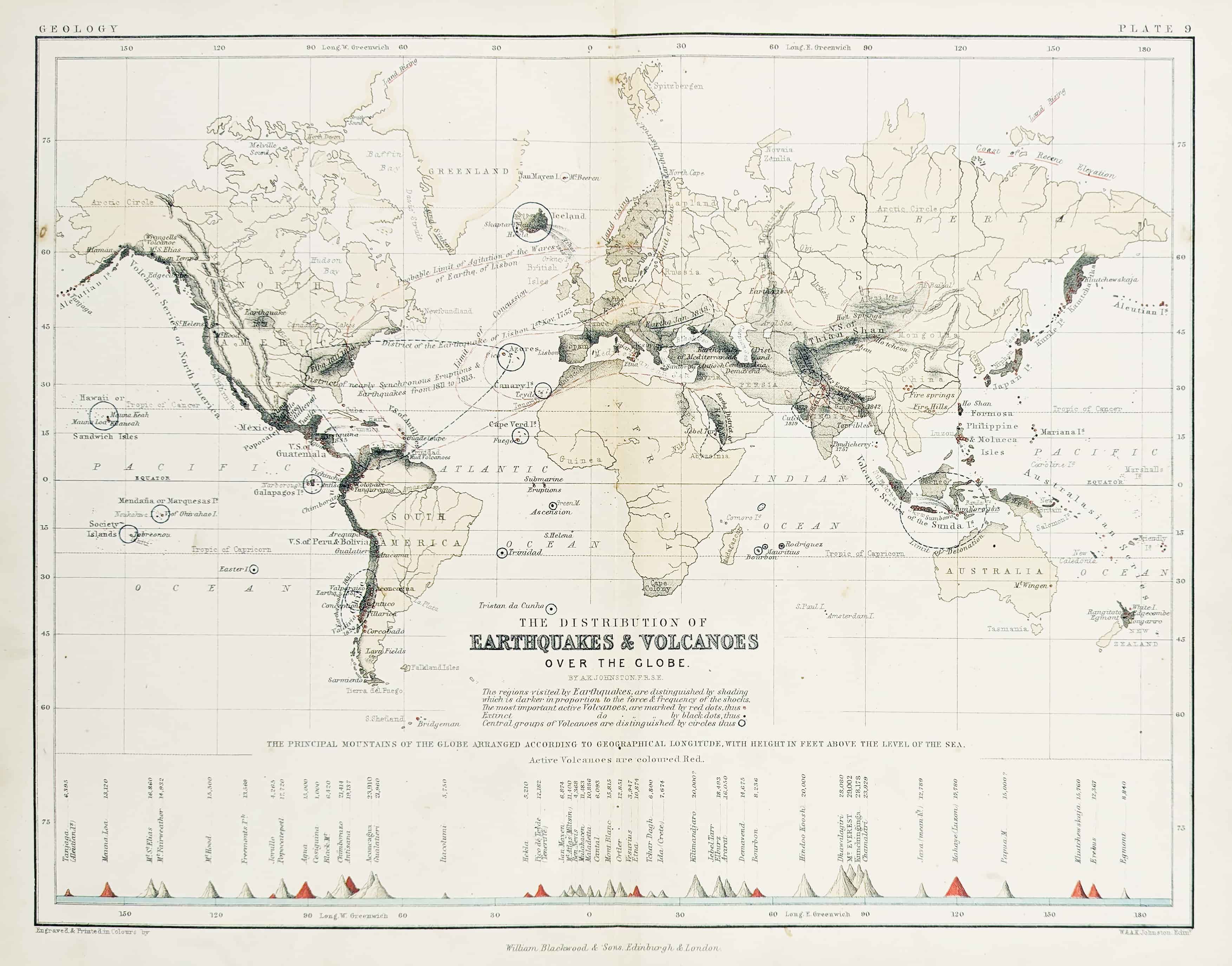 Scarce c.19th map of the world showing the distribution of volcanoes. From: Johnston, A.K., Physical Geography. Collections: State Library Victoria: S 551.4 J64S B (1874 edition) National Library Australia: Bib ID: 1890260 (1871 edition) State Library New South Wales: Call Number … Read Full Description