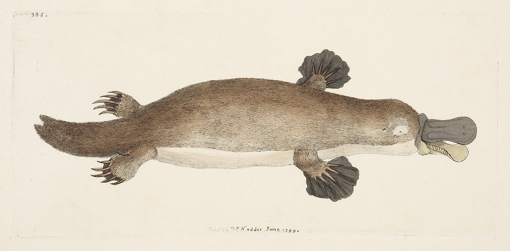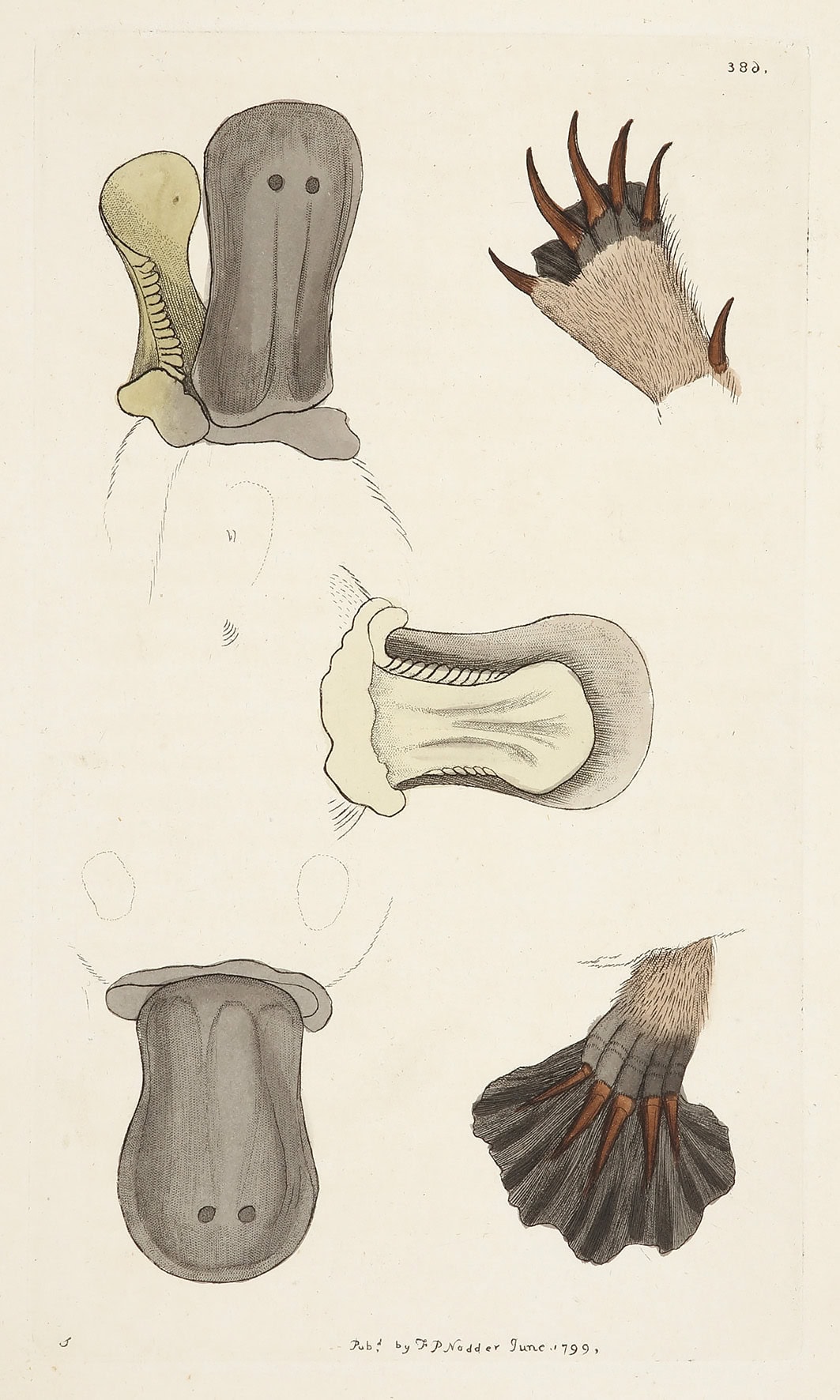 Rare, c.18th hand coloured engraving of the first printed images and description of the Platypus, with the scarce detailed image of the bill and feet.