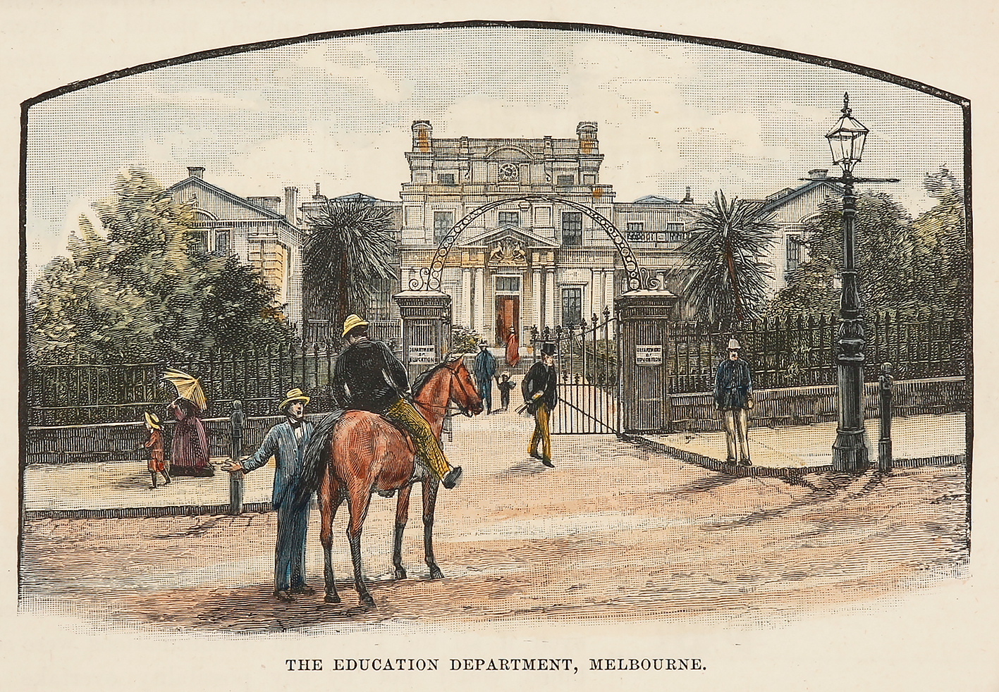 Scarce, c.19th hand coloured engraving of the imposing Education Department building, Melbourne.