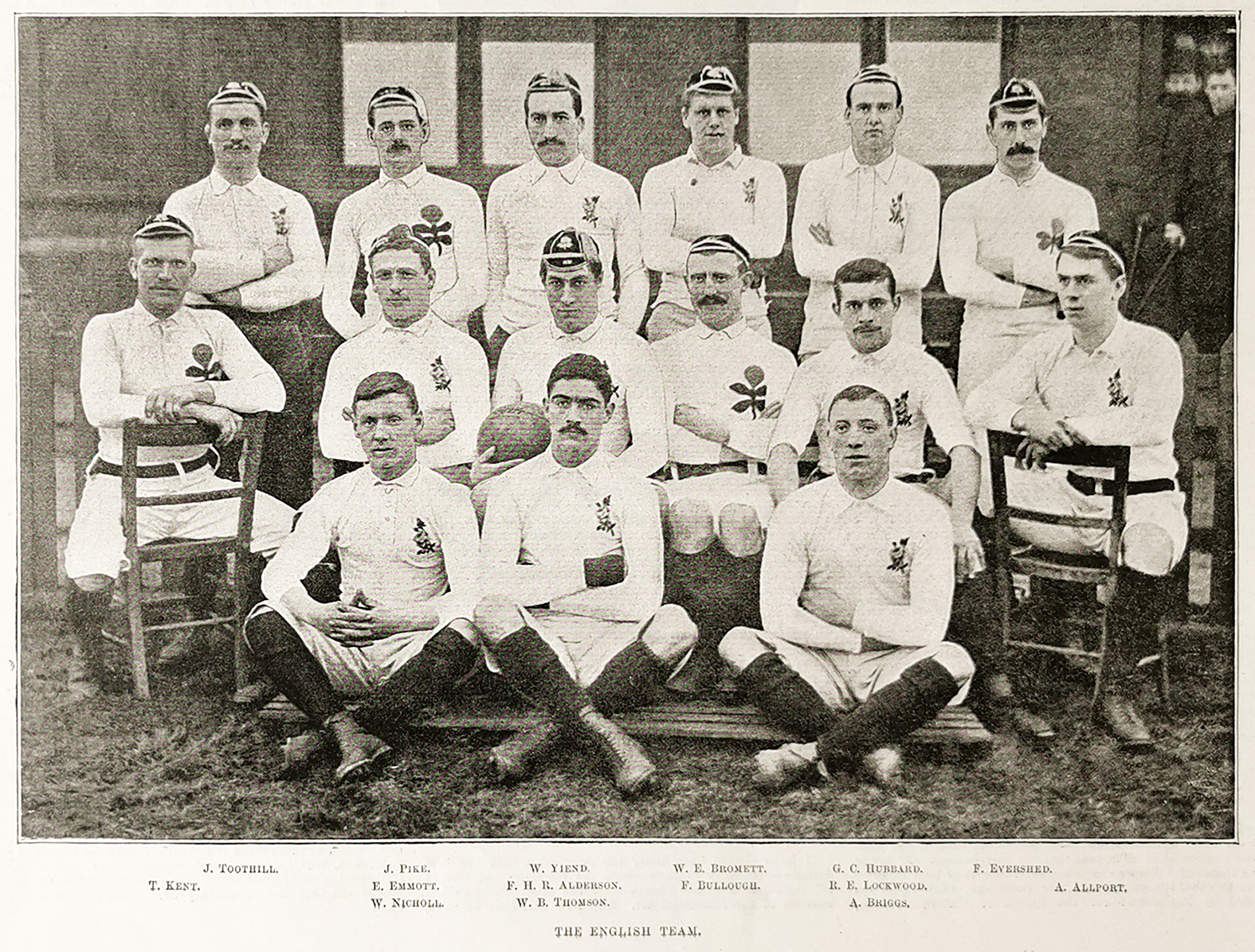 Portraits of the English team. J. Toothill; J. Pike; W. Yiend; W. E. Bromett; G. C. Hubbard; F. Evershed; T. Kent; E. Emmott; F.H.R. Alderson; F. Bullough; R.E.Lockwood; A. Allport; W. Nicholl; W. B. Thomson; A. Briggs. From the original … Read Full Description