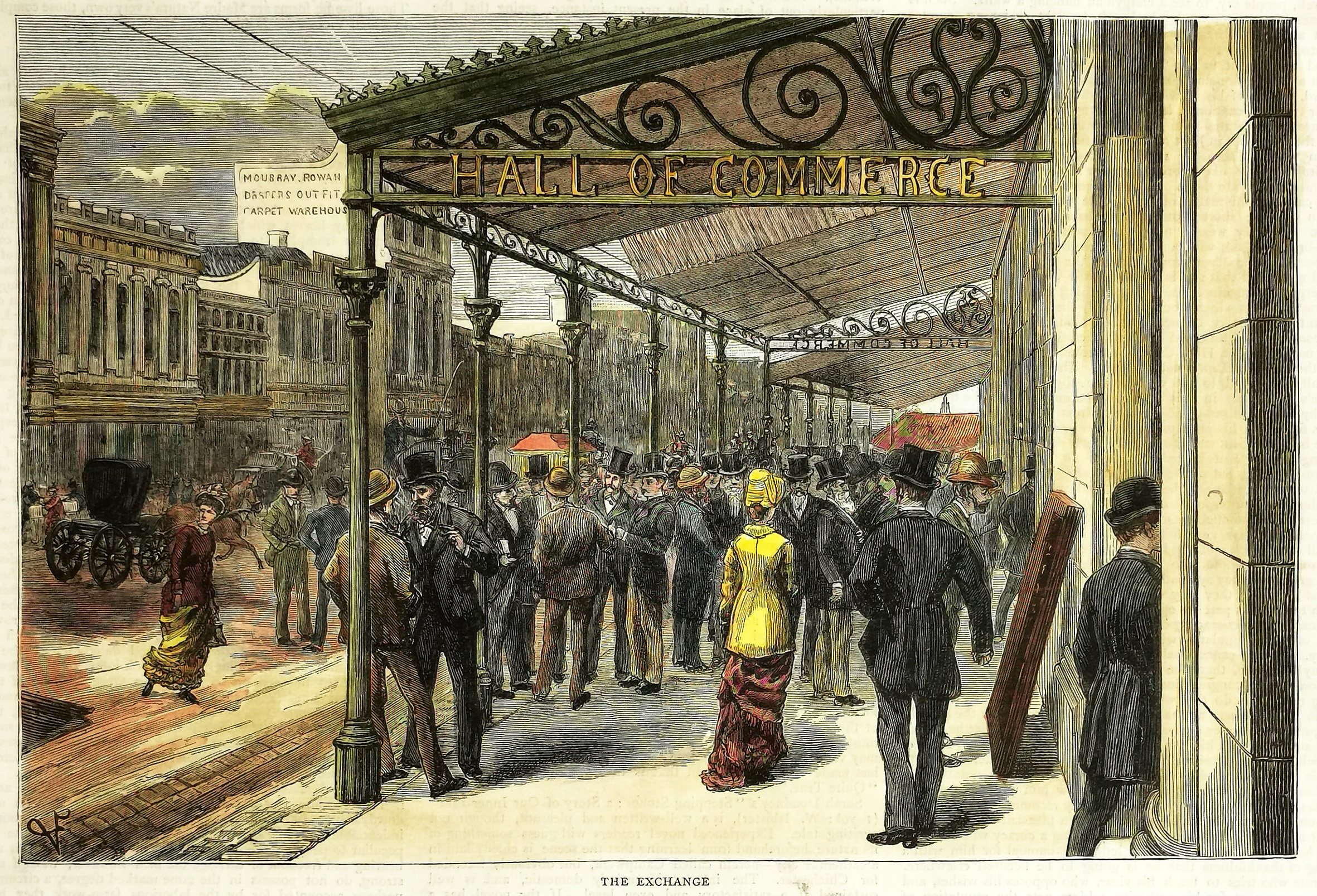 Engraved view of a stockbrokers under the verandah at the stock exchange building in Collins Street, Melbourne. The handful of brokers operating in Melbourne traded in rented space in the Hall of Commerce from 1865 until 1880 and elsewhere in the city until the newly established Stock Exchange of Melbourne (1884) moved into its own building at 380 Collins Street in 1891.