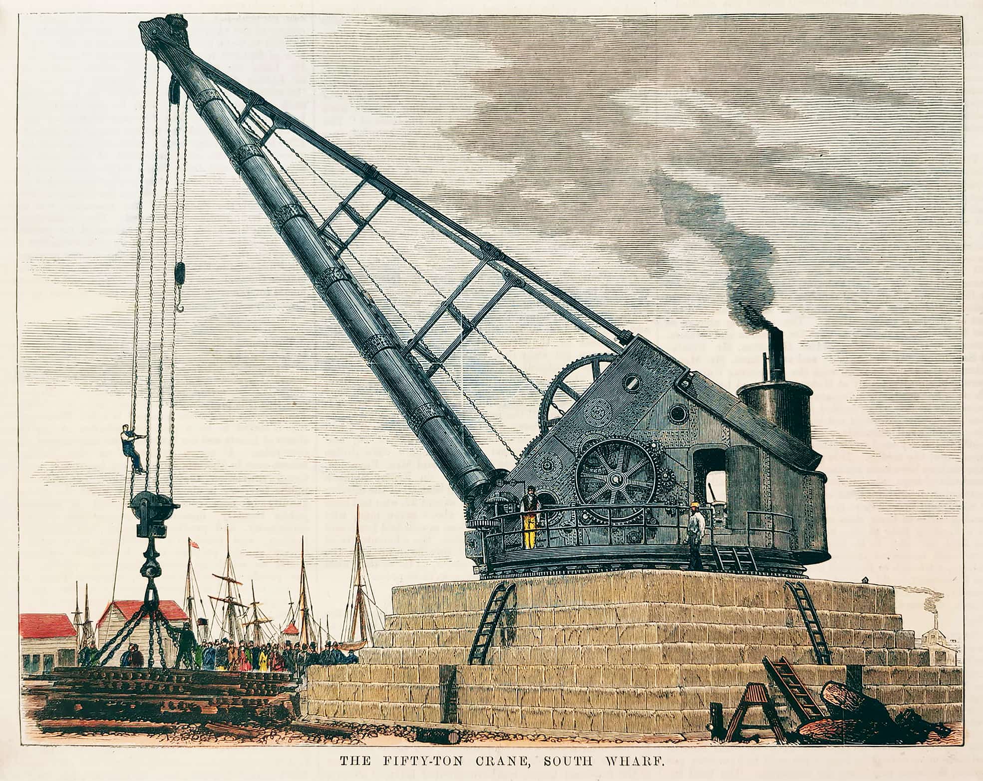 Scarce image of the Fifty-Ton steam crane, South Wharf, Melbourne. From the original edition of the Australasian Sketcher.
