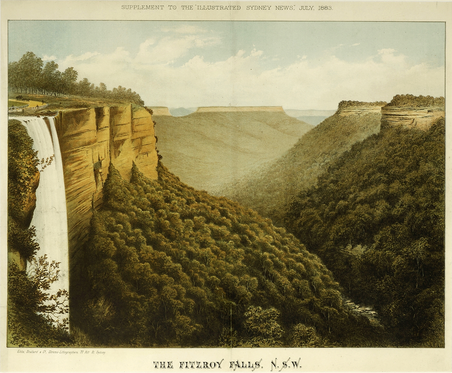 Very rare supplement of Fitzroy Falls from the Illustrated Sydney News dated 7 July 1883. Although discovered by Charles Throsby in 1818-1819 during his explorations in the area they were not named until 1850 following a visit by Governor Fitzroy.