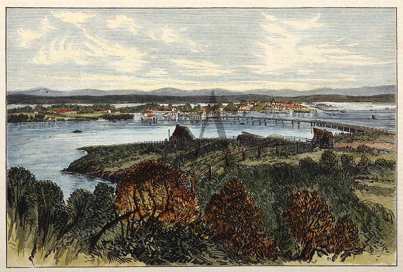 Very rare engraving of Balclutha, New Zealand showing the 1868 bridge that was washed away in the floods of 1878, from the original edition of the Australasian Sketcher.