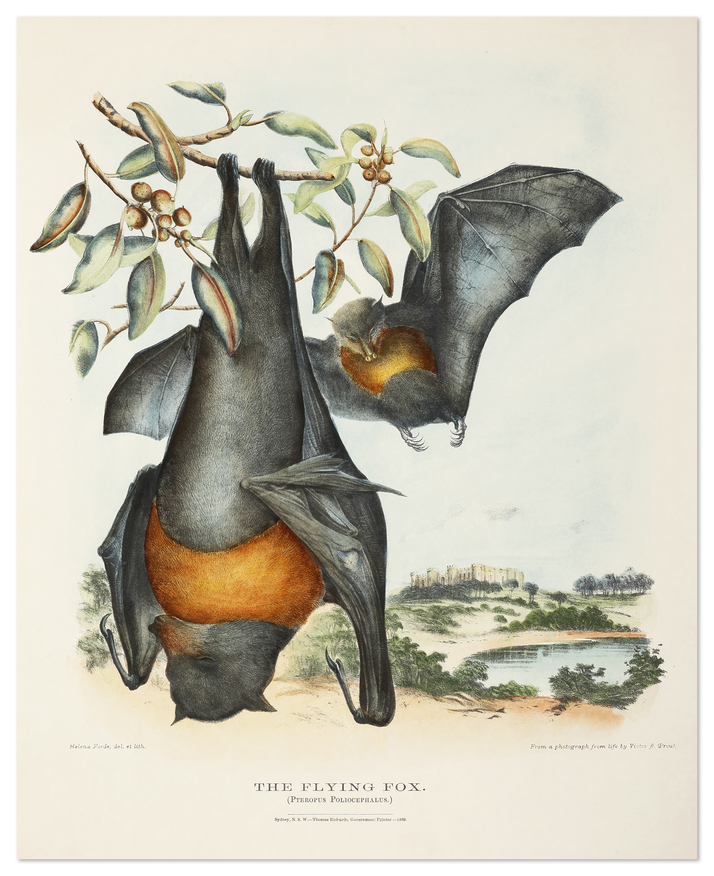 Large lithograph of the Grey-headed Flying-fox, the largest bat in Australia with an average wingspan of up to one metre by Helena Forde (nee Scott). The view is taken from the Sydney Botanic Gardens looking towards the present day Conservatorium. The Botanic Gardens which is still a favourite roosting area for them. This is one of the best and largest images made.