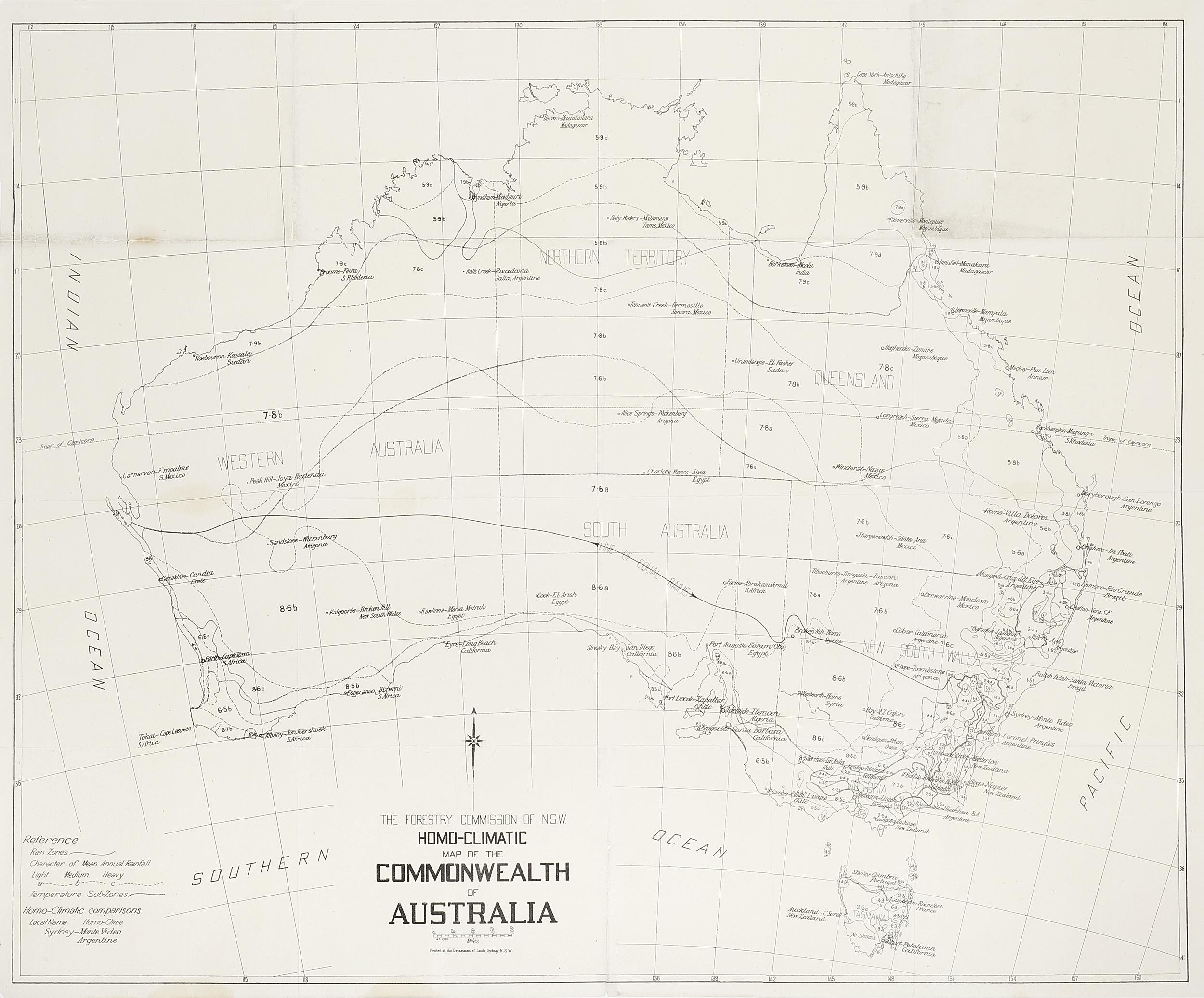 Very c.20th interesting map of Australia showing comparative climate areas with similar international places. A key at left indicates the annual rainfall from light to heavy.