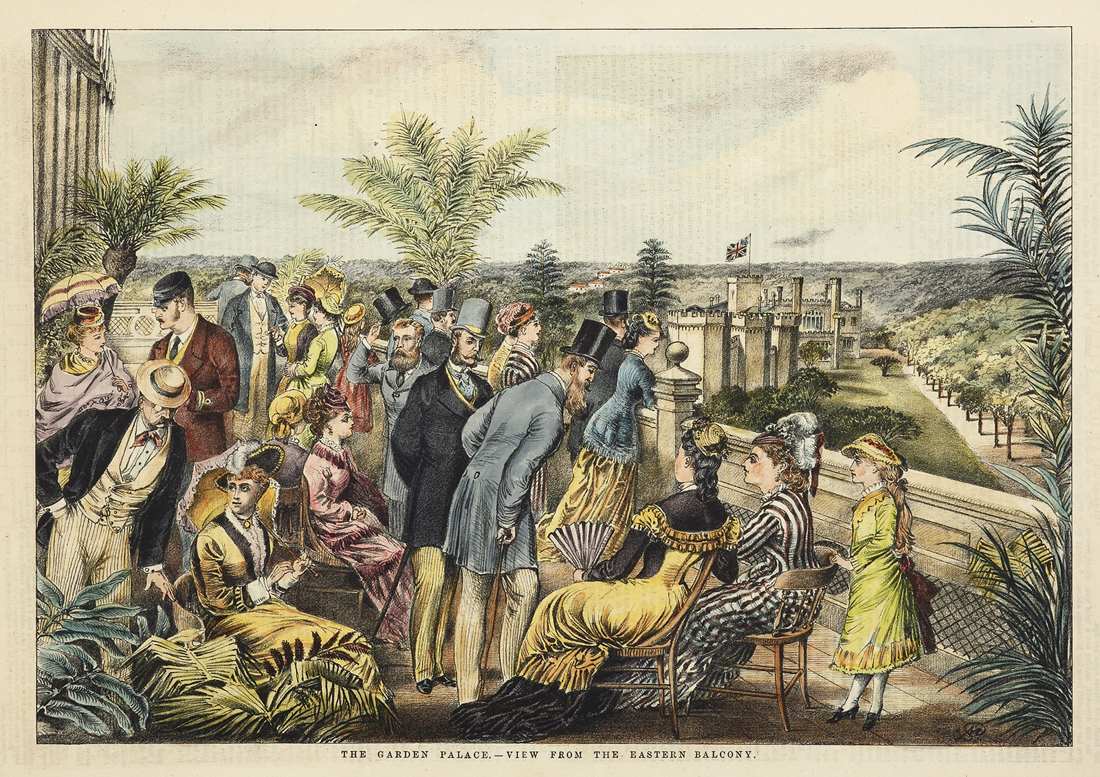 Rare lithograph of well dressed people on the eastern balcony of the Garden Palace which overlooked Government House.