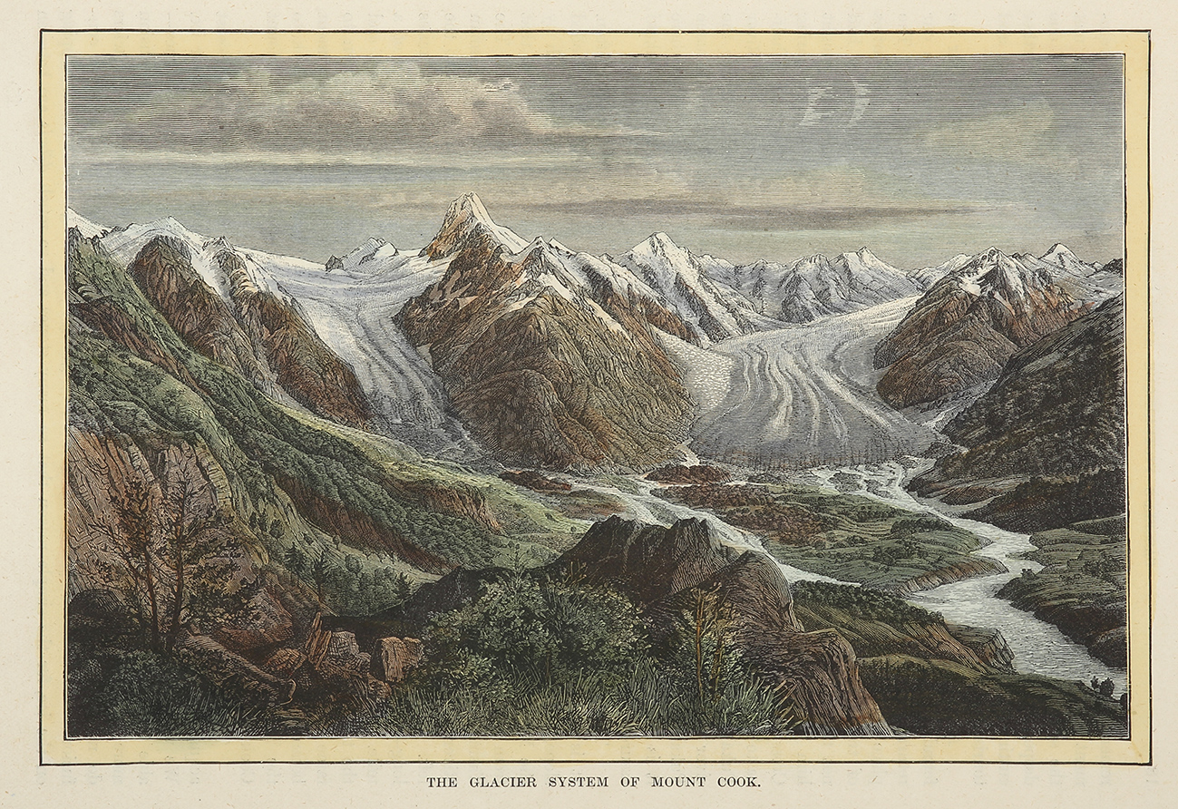 Scarce c.19th hand coloured engraving of Mount Cook, the highest mountain in New Zealand.