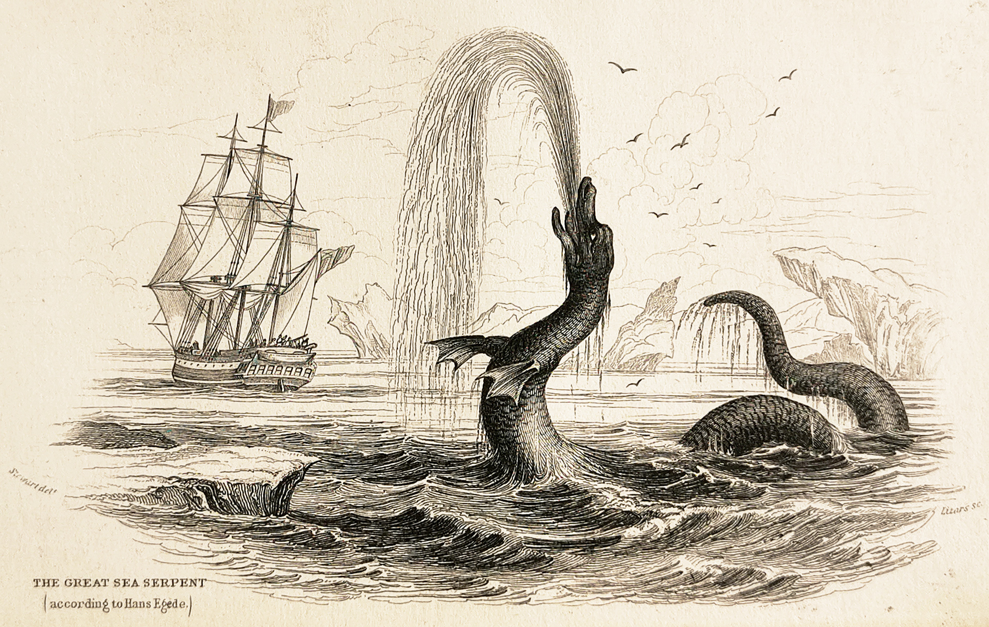 Small engraving of the sea monster drawn by Hans Egede (1686 – 1758).