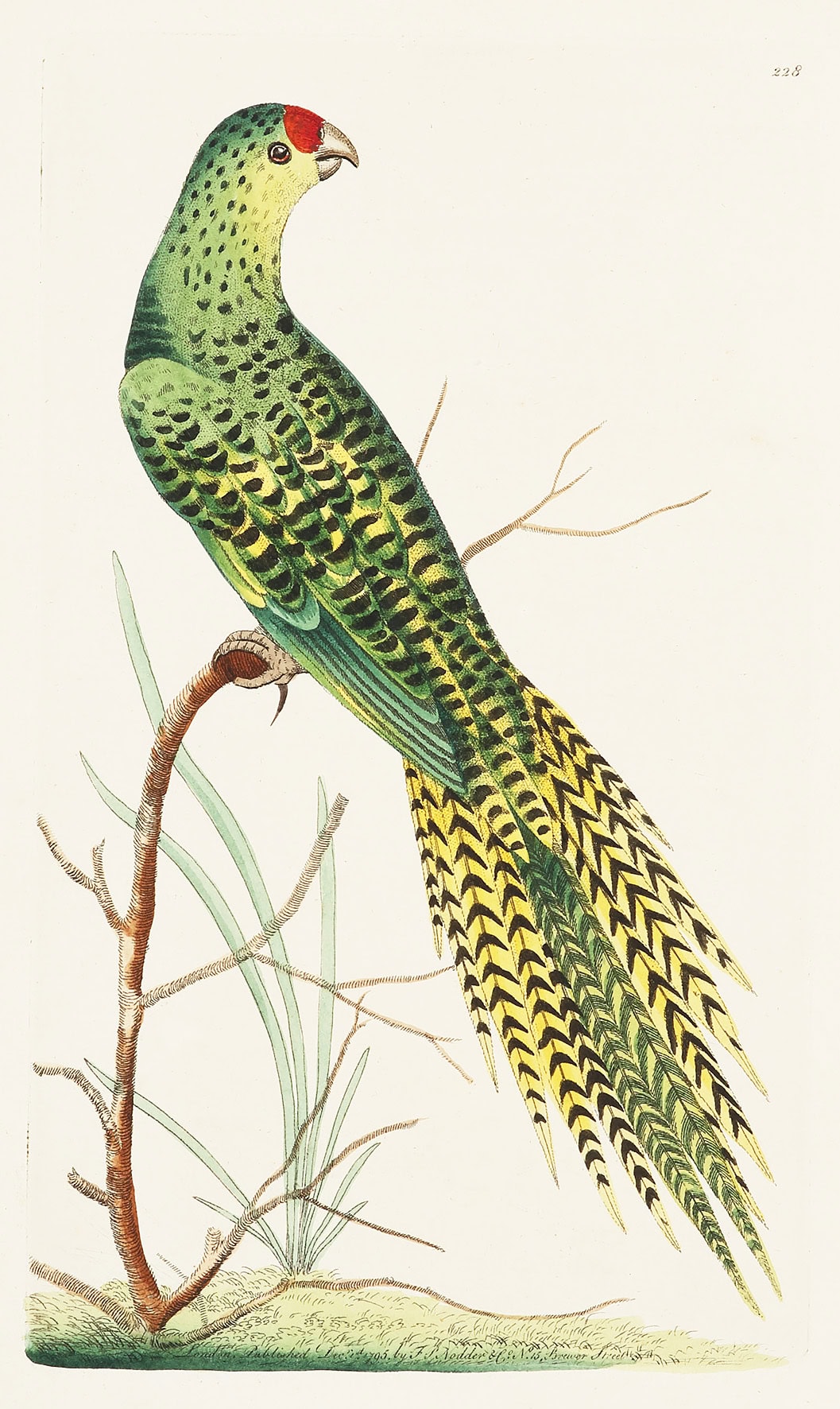 Rare c.18th hand coloured engraving of the Eastern Ground Parrot, which was first sighted on 21st January 1788 by surgeon Arthur Bowes, in Port Jackson and described and drawn in his diary on the transport ship Lady Penrhyn. His diary entry describes his observations.