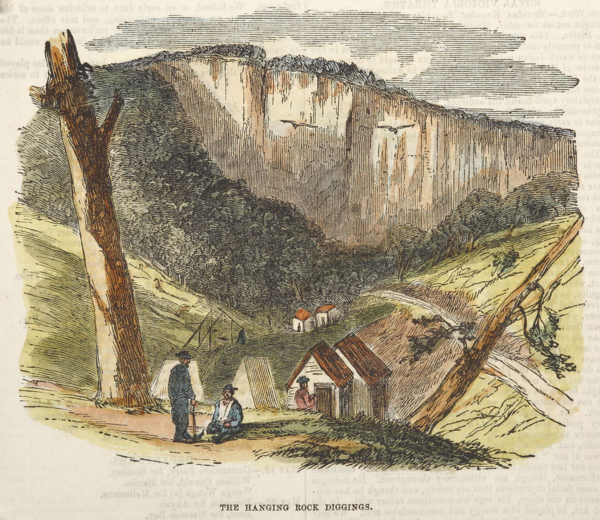 Rare colonial engraving of the Hanging Rock diggings in 1855 which was a former gold mining town, situated about 10 km south east of Nundle, NSW.