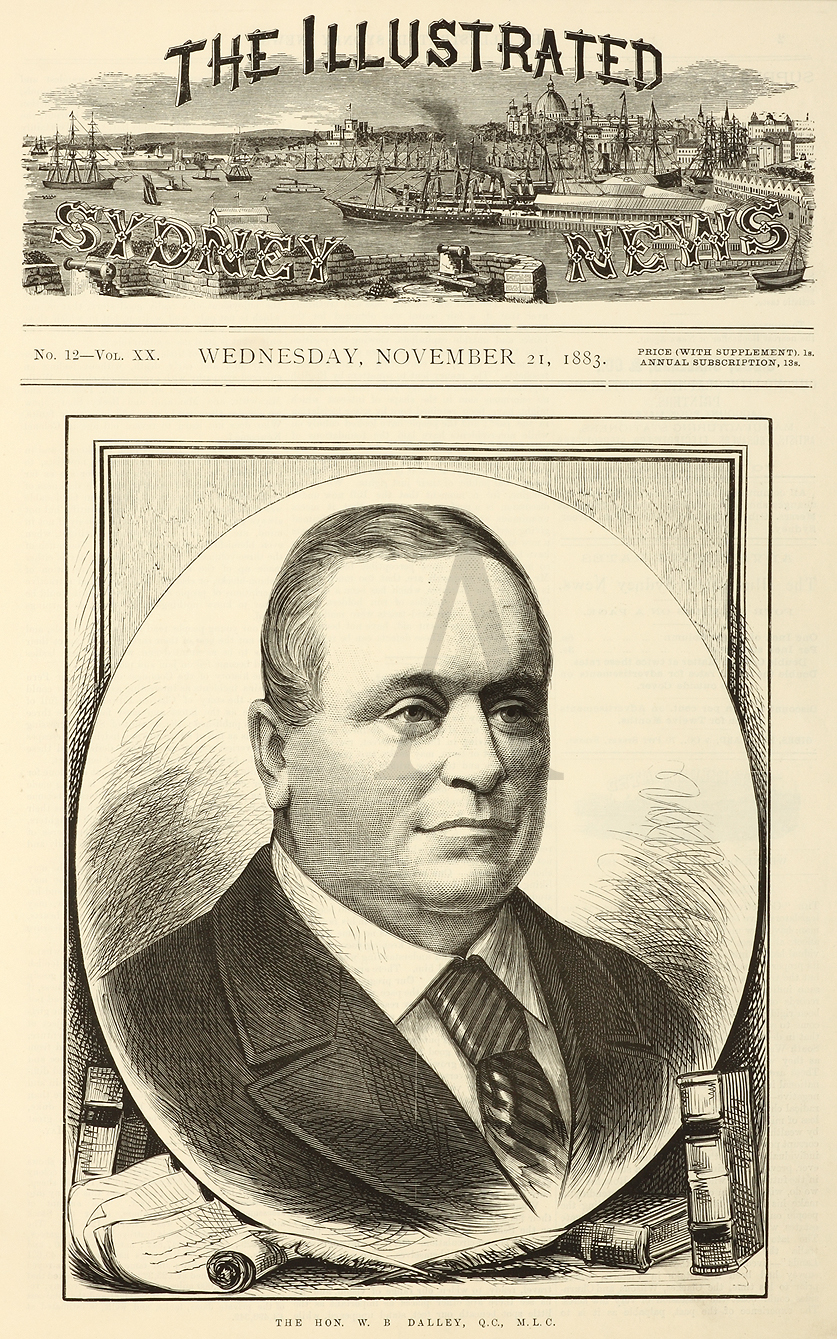 Rare portrait of William Bede Dalley (1831-1888) who was an Australian politician and solicitor, and the first Australian appointed to the Privy Council of the United Kingdom. From the original edition of the Illustrated Sydney News.