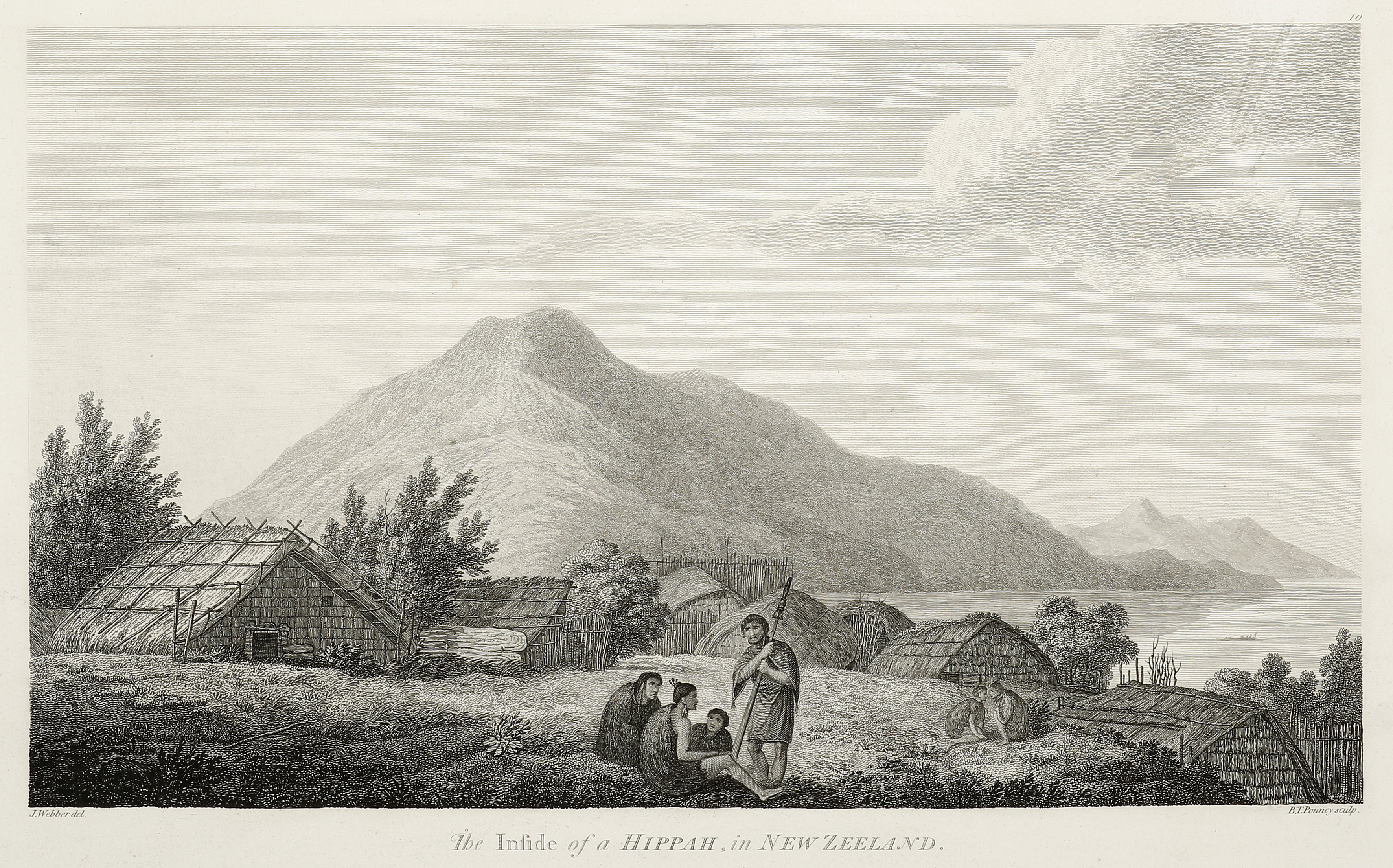 The pā shown is probably the fortified village on the island of Motuara, at the north eastern tip of New Zealand’s south island which Cook visited on 15 February and by Anderson on 20 February, 1777. The view is taken looking north with Motuara in the background. It was visited by Cook on his first voyage, then Furneaux on the second voyage where he established his winter quarters and William Bayly’s his observatory. Between the second and third voyage, the  had been rebuilt but was again deserted. This gave Webber an opportunity to also sketch it from the inside.