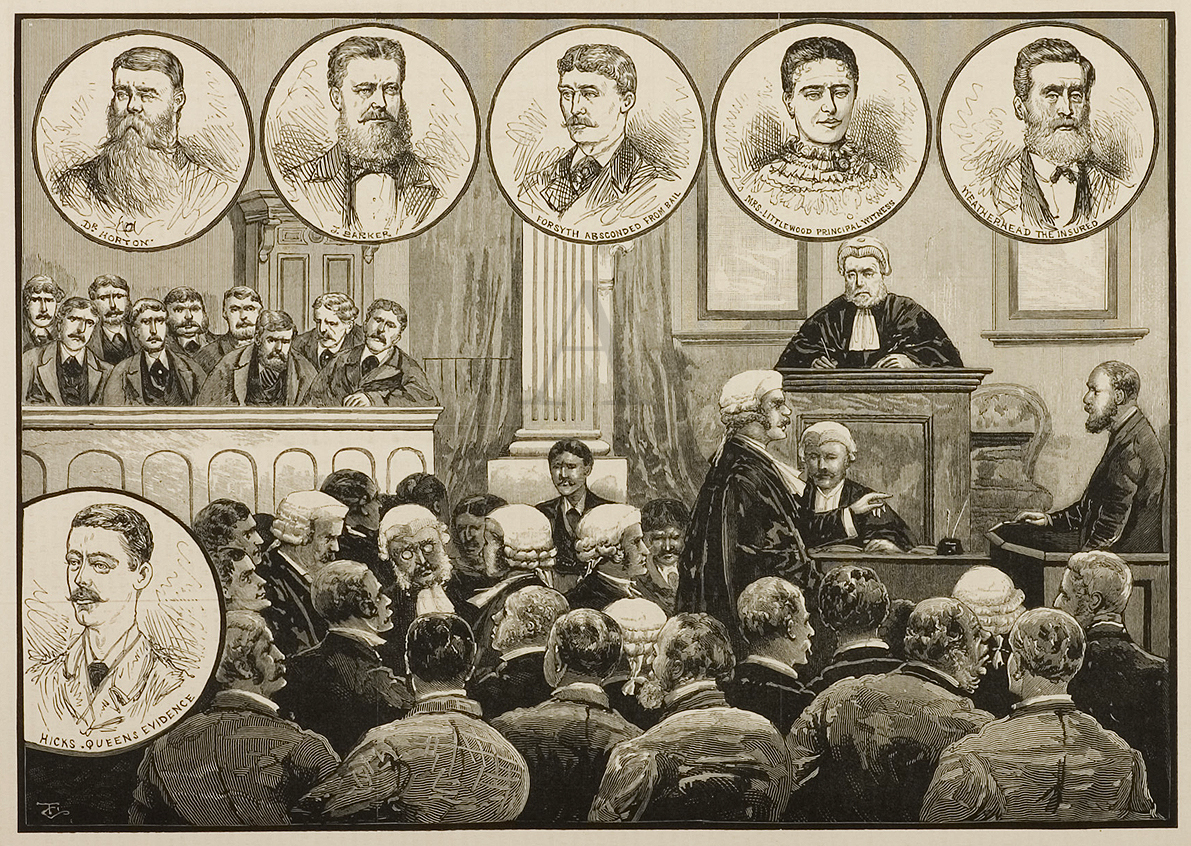 Scarce engraving of the trial of Barker, Horton, and Monson, the remaining defendants charged with conspiring to defraud the Australian Alliance Insurance Company of £5,000.