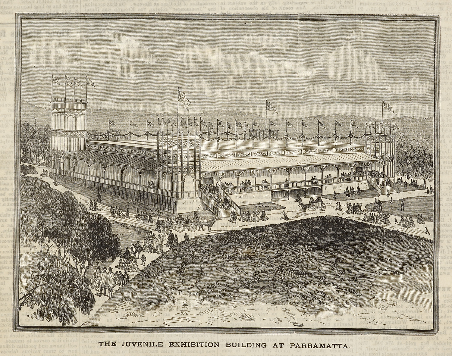 Rare engraving of the Juvenile Exhibition building at Parramatta held 19 Dec 1883 – 09 Feb 1884 and situated near the colony’s first Government House.