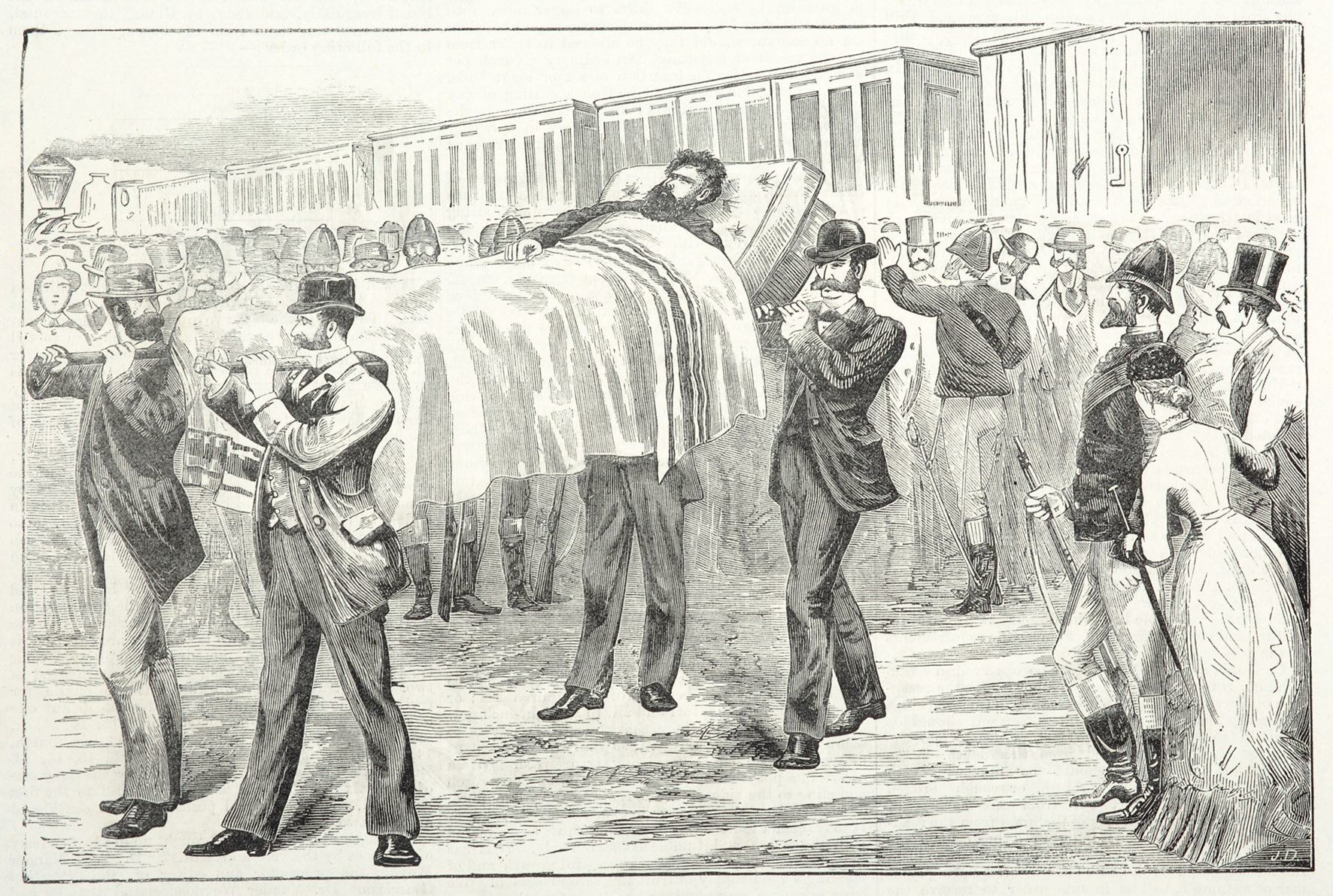 Rare of Ned Kelly’s arrival in Melbourne and carried in a stretcher.. From the original edition of the Illustrated Sydney News.