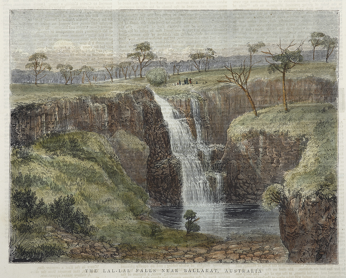 Scarce engraved view of La-la Falls, Victoria. From the original edition of The Graphic. Collections: State Library New South Wales: CALL NUMBERS TF00009 National Library Australia: Bib ID 2855507 State Library Victoria: Record ID 9910359523607636 Met Museum New York: Accession Number: … Read Full Description