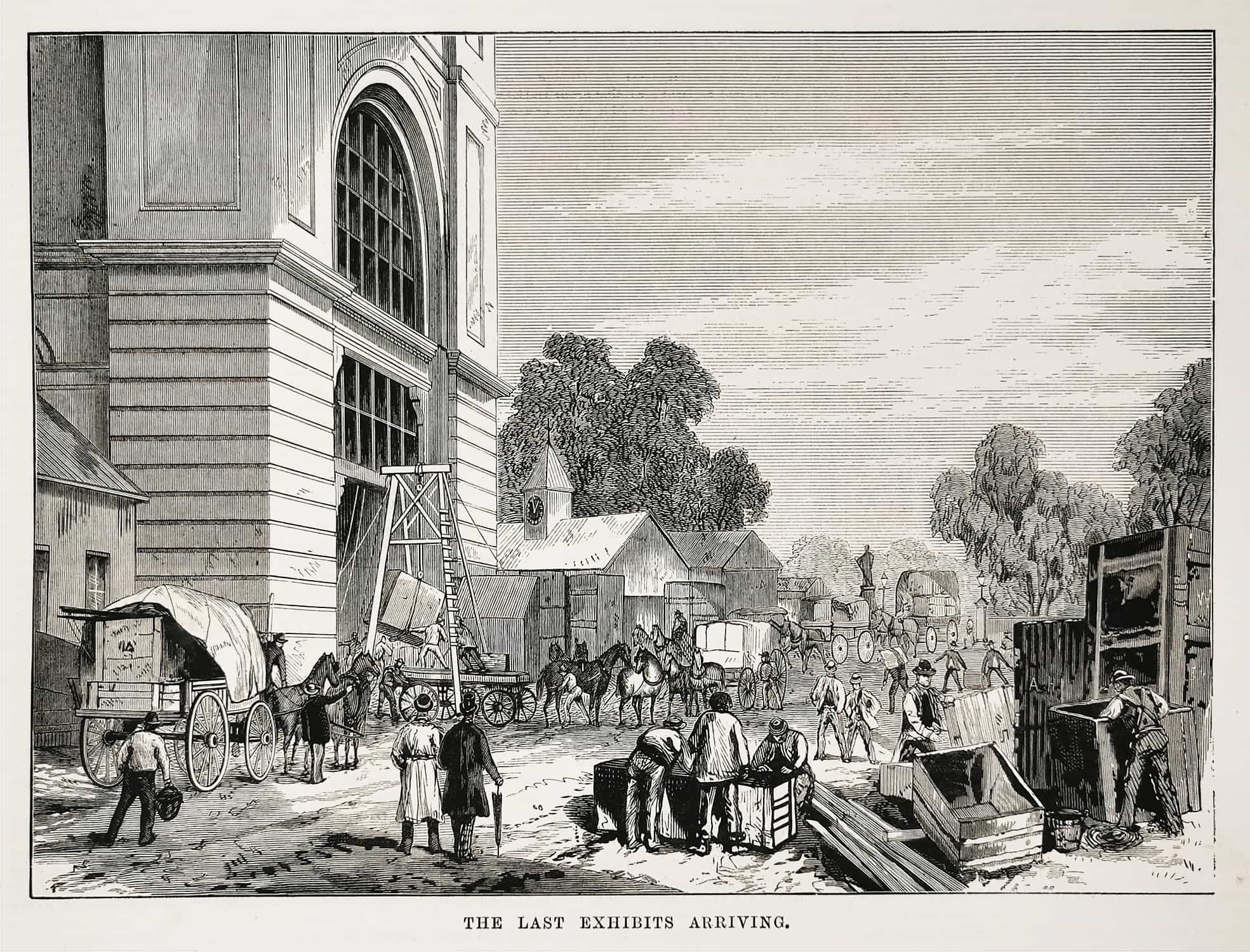 Engraving showing the last exhibits arriving, from the original edition of the Australasian Sketcher.