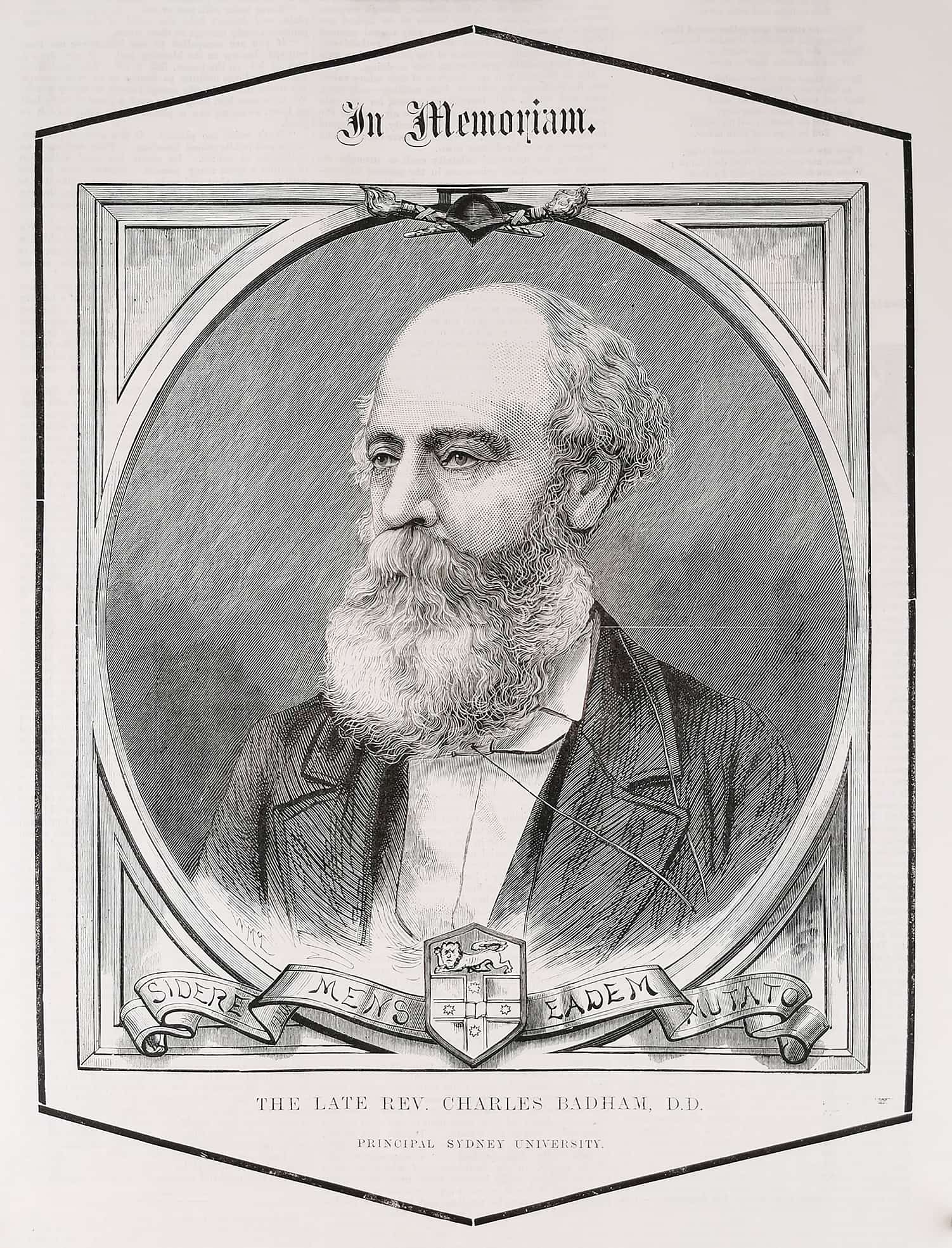 Rare engraving of Charles Badham (1813-1884), who succeeded John Woolley as professor of classics at Sydney University. He was also trustee for Sydney Grammar School.