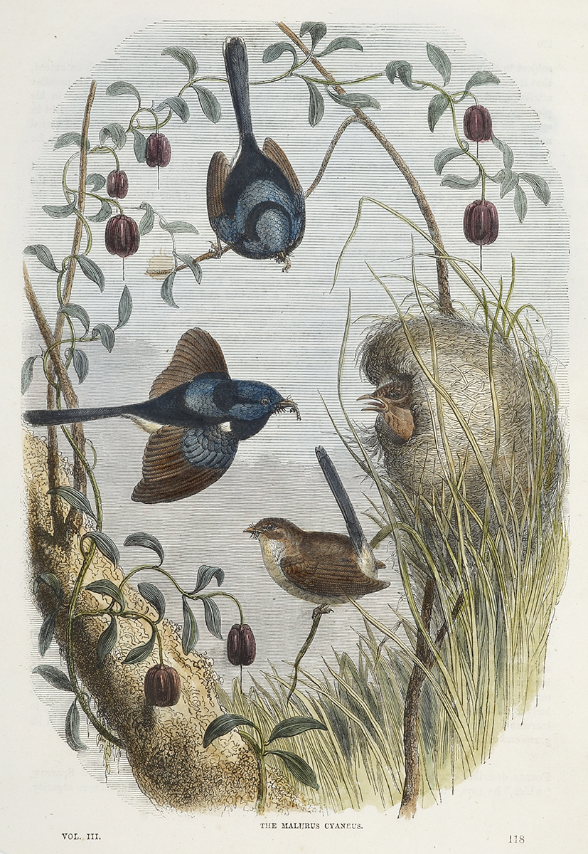 Scarce c.19th engraving of the Superb fairy-wren. The first specimen of the Superb Fairy-wren was collected by William Anderson, surgeon and naturalist on Captain James Cook’s third voyage in 1777 when they visited Adventure Bay, Tasmania. He named it Motacilla … Read Full Description
