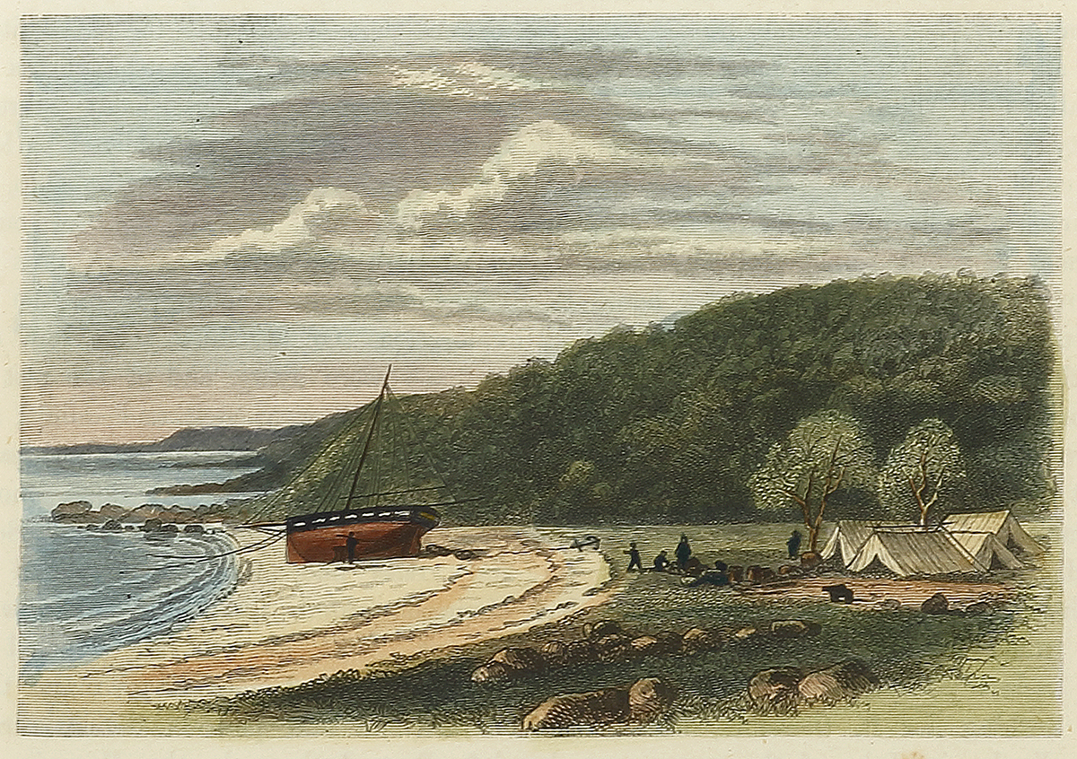 C.19th engraved view of Careening Bay, Western Australia with Her Majesty’s Cutter Mermaid careened on the beach. The Bay was named in commemoration of the event.